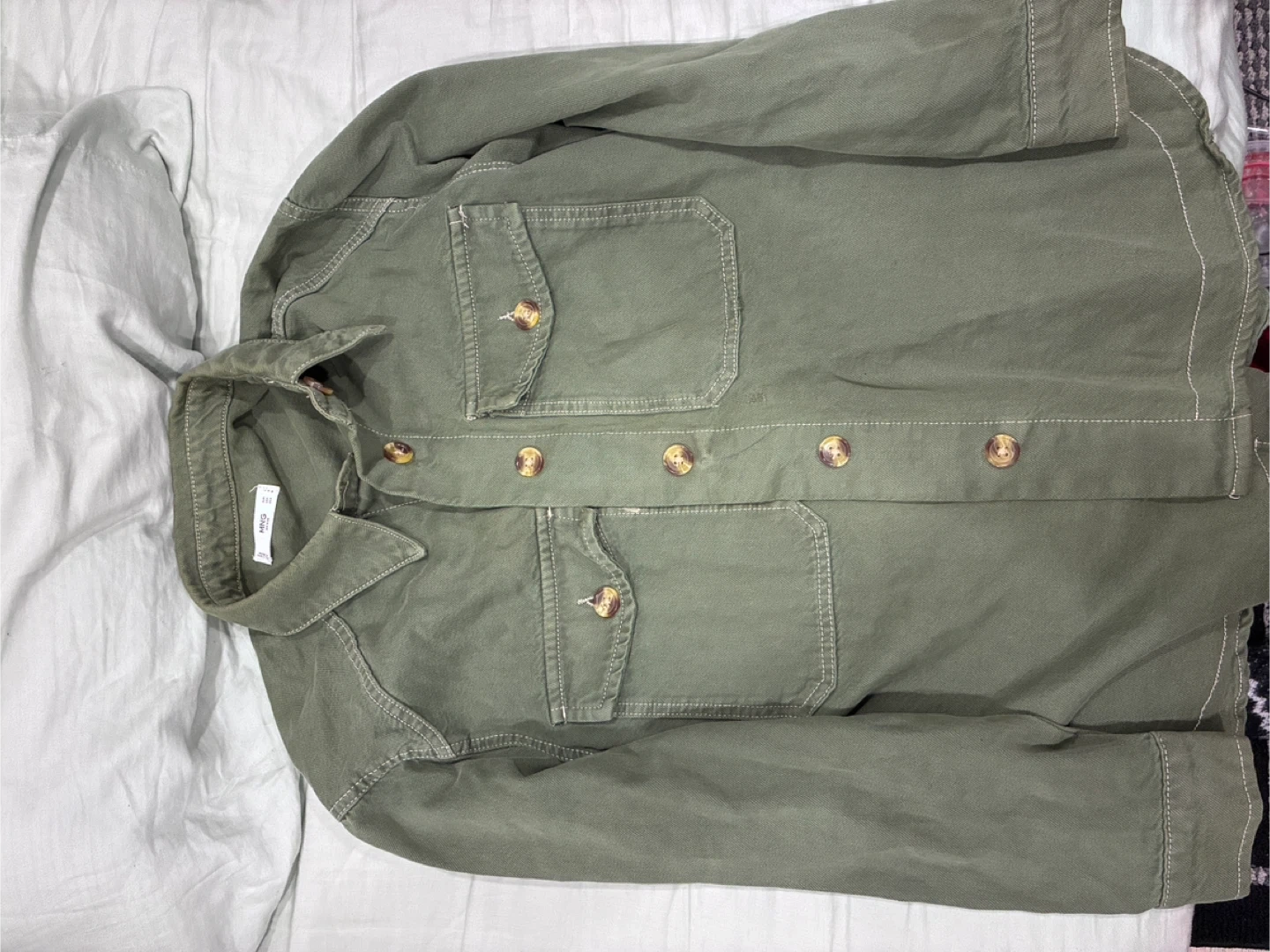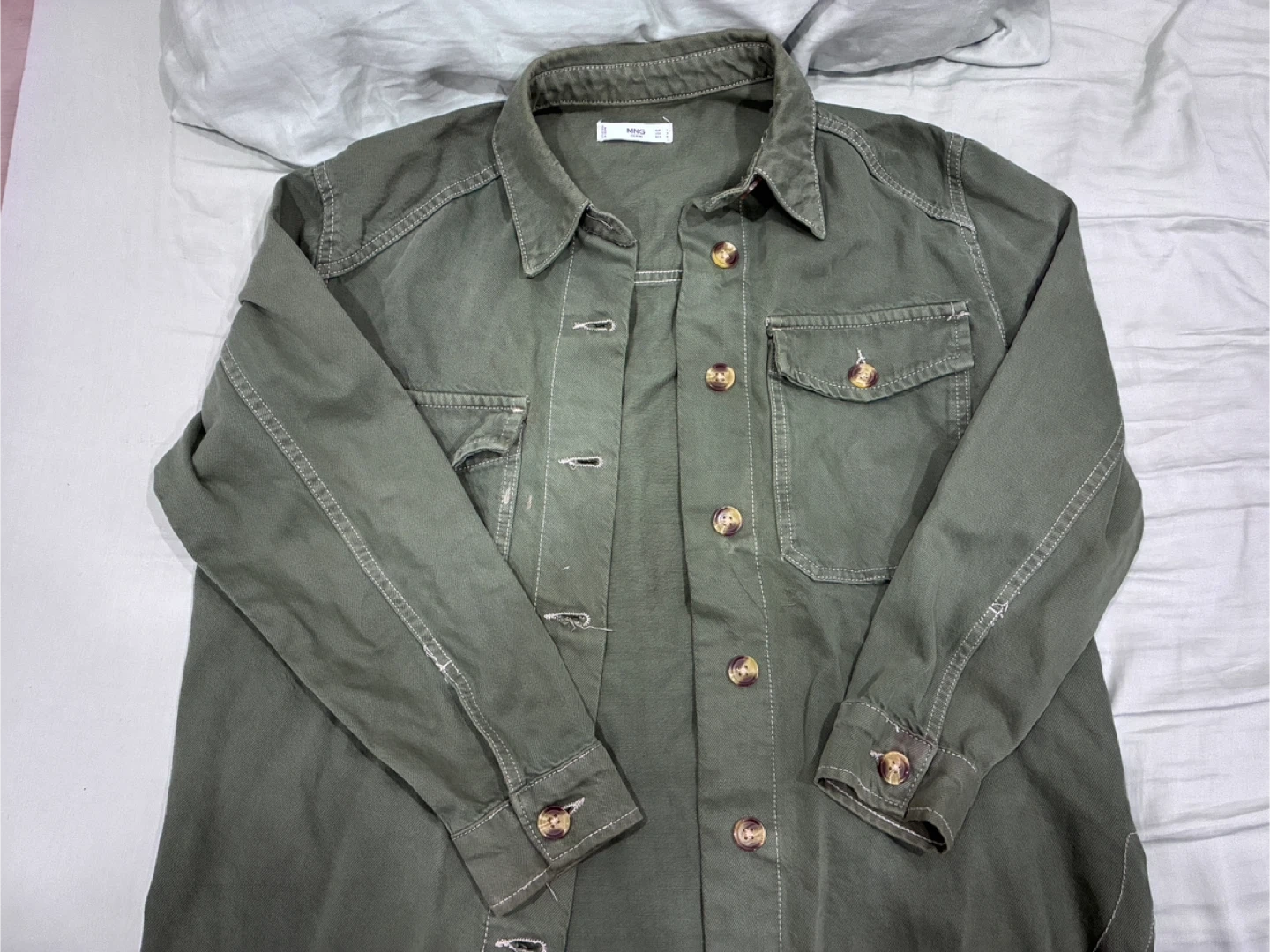 This is a lovely olive green jacket from Mango! It features a button-up design with two chest pockets and is made from a comfortable material. Perfect for layering or wearing on its own during milder weather. It's in great condition and has only been worn a couple of times, there’s a small unnoticeable stain on one front pocket.