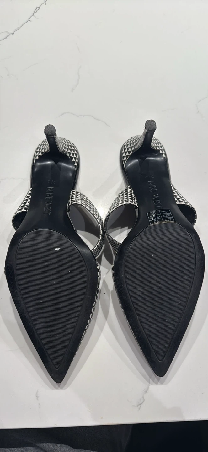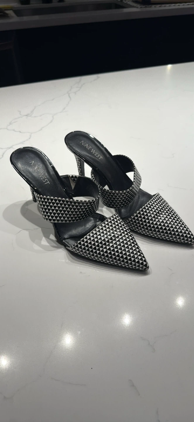 Selling a pair of Nine West heels in a striking black and white geometric pattern. They are a size 7.5.