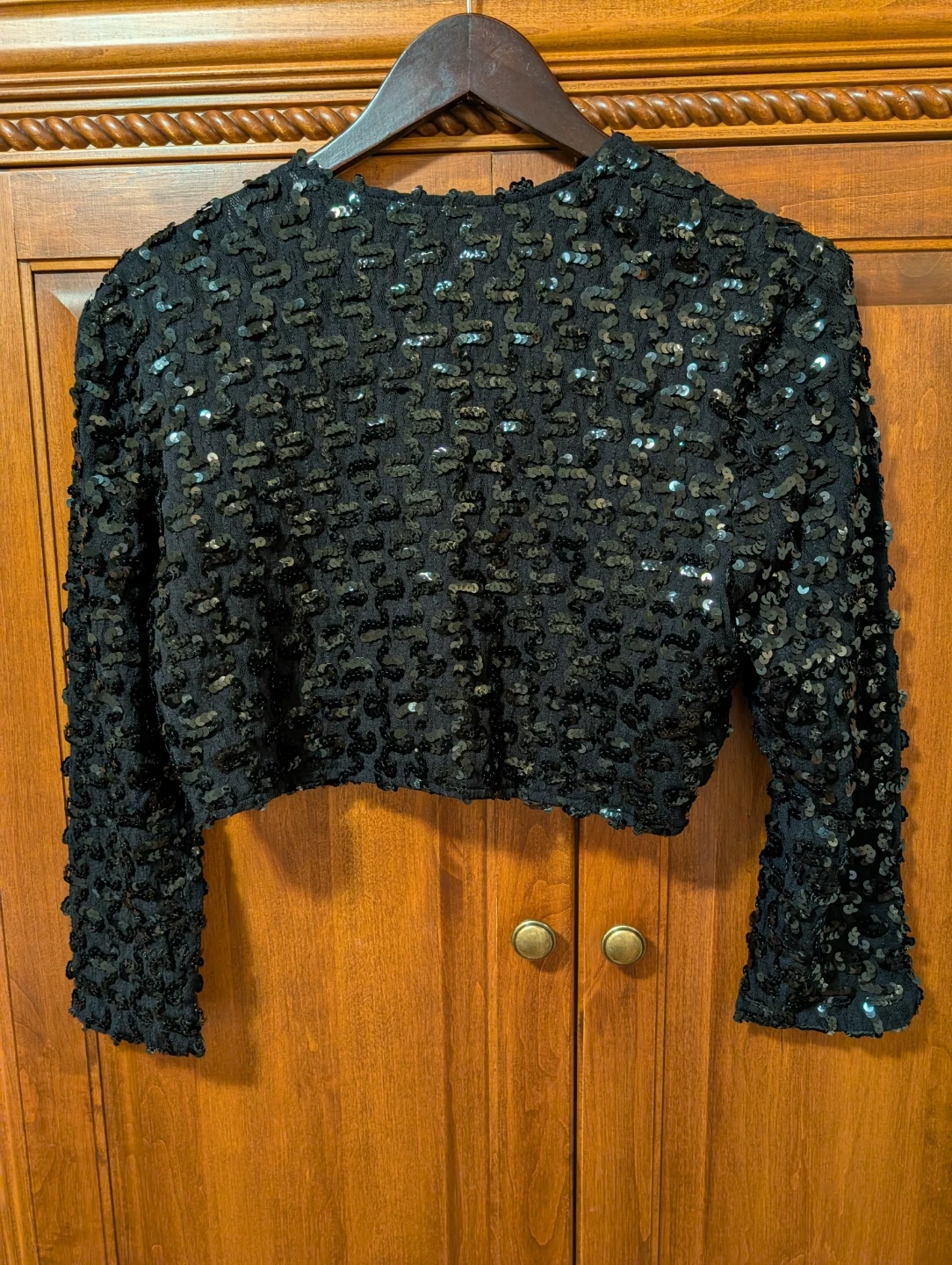 Cattiva cropped jacket, perfect for adding some sparkle to your outfit! It's a beautiful black colour and covered in sequins. It's in great condition and a classy addition to that holiday outfit. Size small. Pick up in Kitsilano