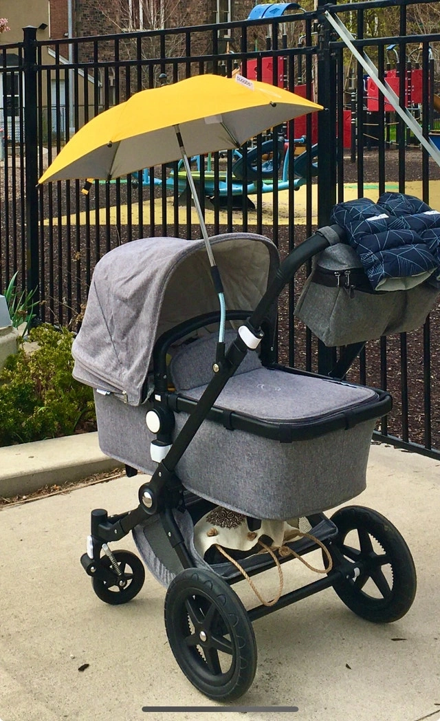 Versatile grey stroller with bassinet (pram) and toddler seat. Includes Bugaboo yellow summer parasol. Smooth ride, modular design, great condition. Over $1,300 retail with accessories — asking $350. Pickup near Leslieville area