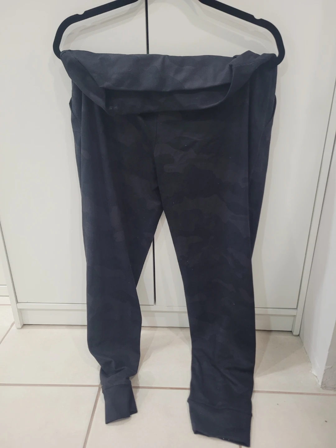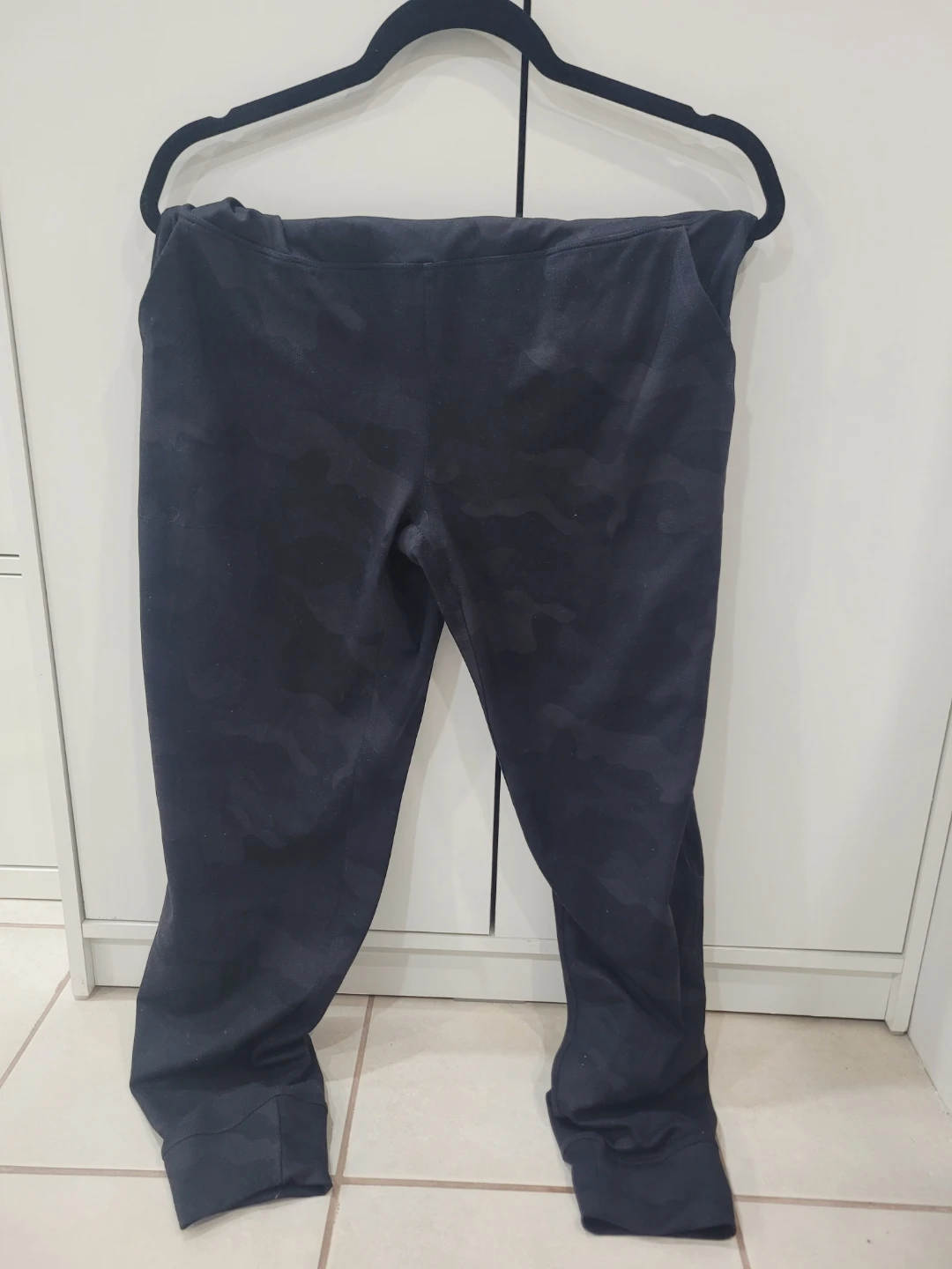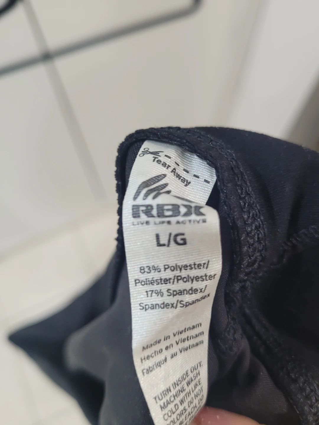 Selling a pair of RBX Live Life Active joggers in size large. They are black with a subtle camo pattern. The material is 83% polyester and 17% spandex.