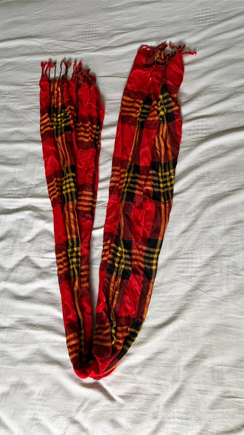 A colourful red scarf with a plaid pattern, perfect for adding a pop of colour to any outfit. It's in great condition and ready for a new home! Used once