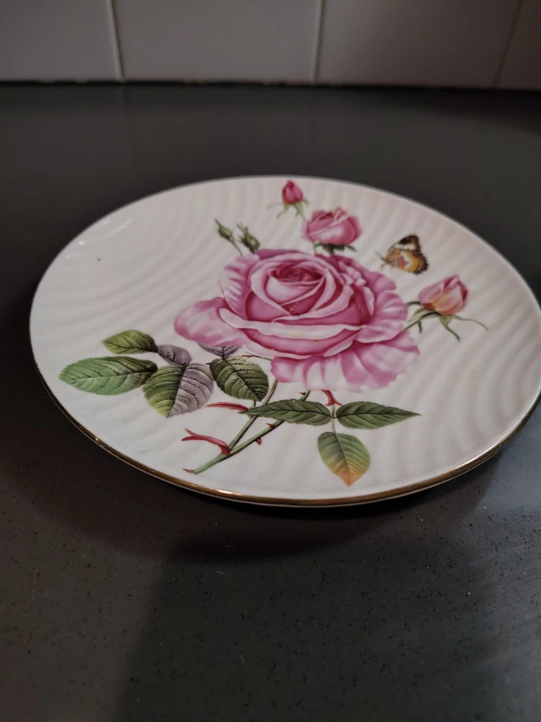 Here's a lovely decorative plate featuring a beautiful rose design. It would be a charming addition to any collection or as a standalone piece on a shelf or table