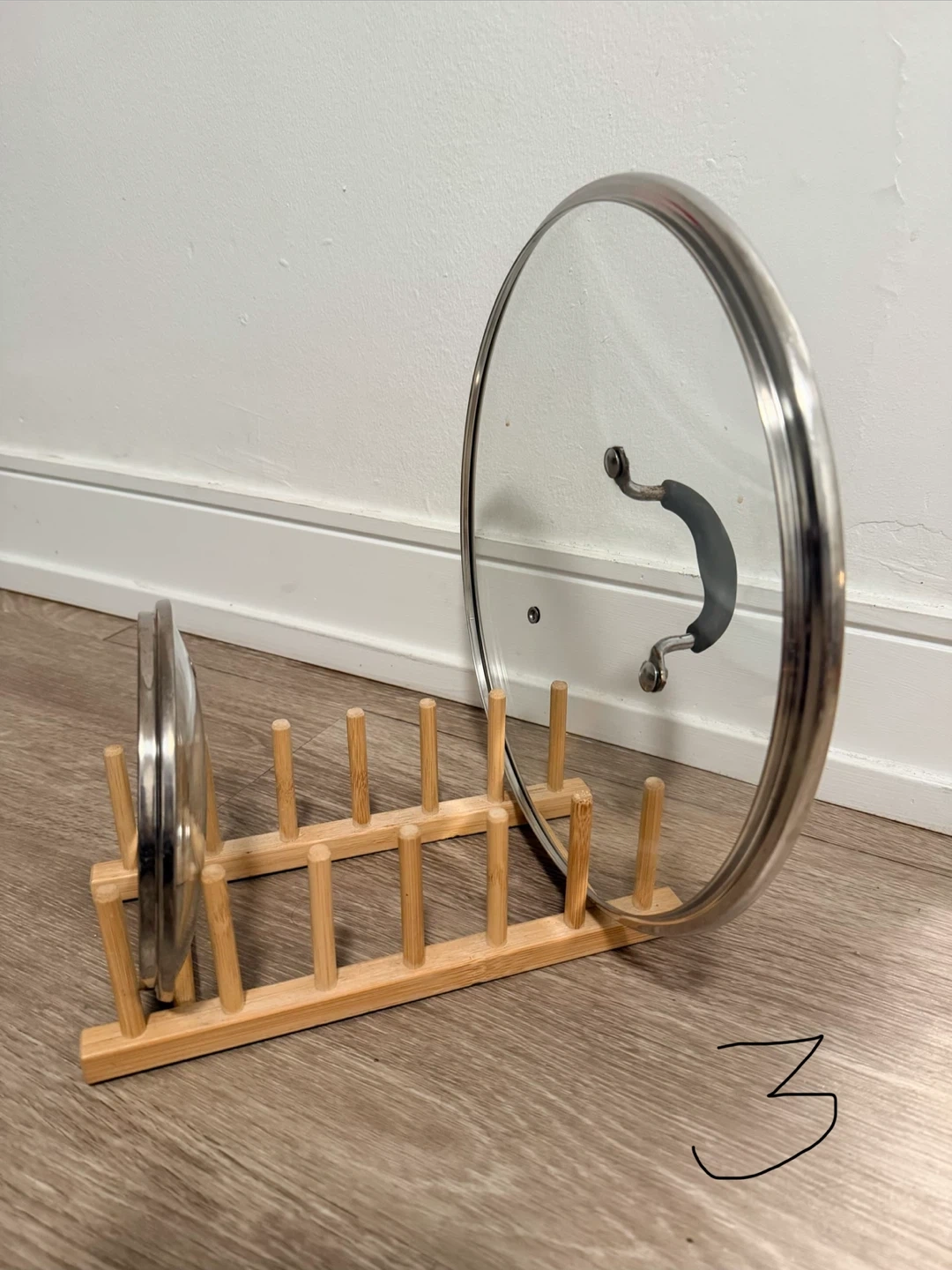 Here's a handy bamboo pot lid/plates organizer rack! It's perfect for keeping your pot lids neat and tidy in your kitchen. It's in great condition and ready to use