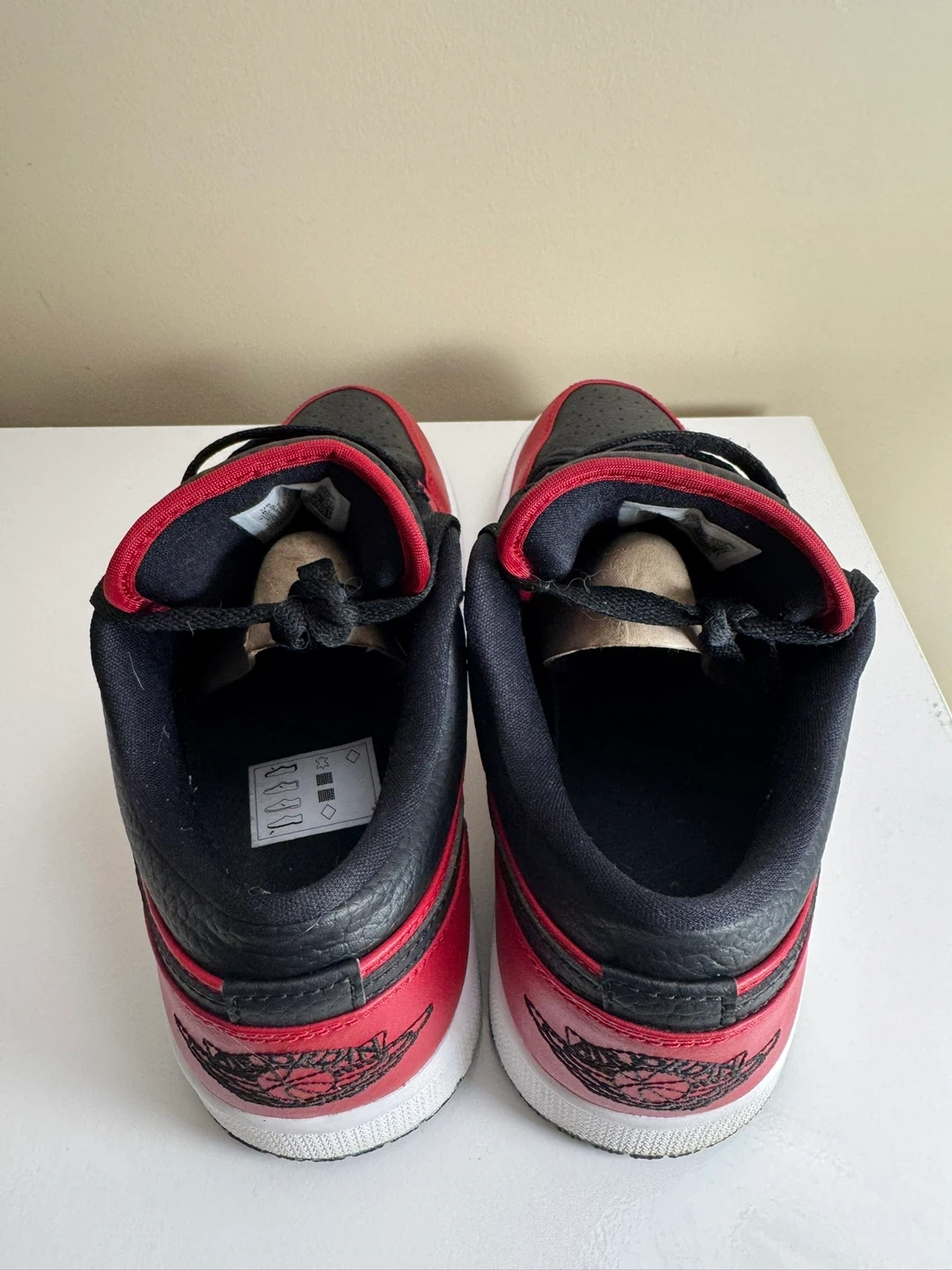 Selling a pair of Nike Air Jordan 1 Low sneakers in red and black! They are in great condition and come with the original box. The size is 8.5 US, 7.5 UK, and 26.5 cm.