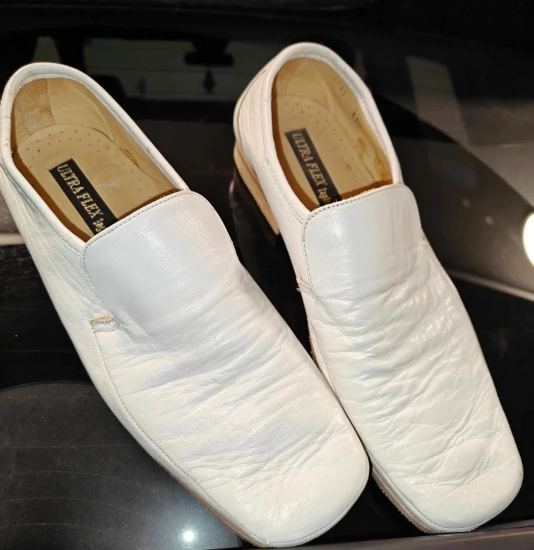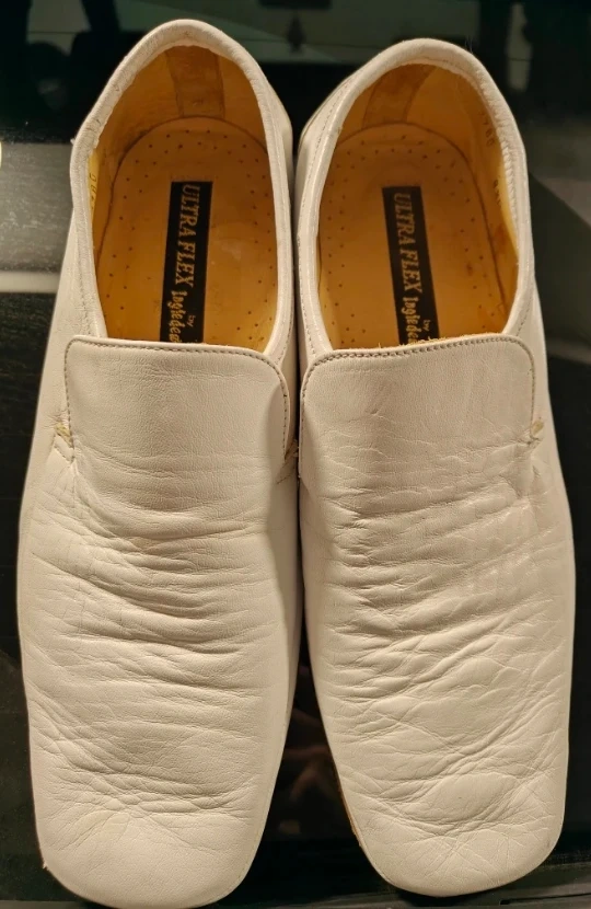 Here are a pair of Ultra Flex by Ingledew's loafers! They are white leather and have a unique sole pattern. Won't find a better offer for the condition these foxy babies are in ๐
