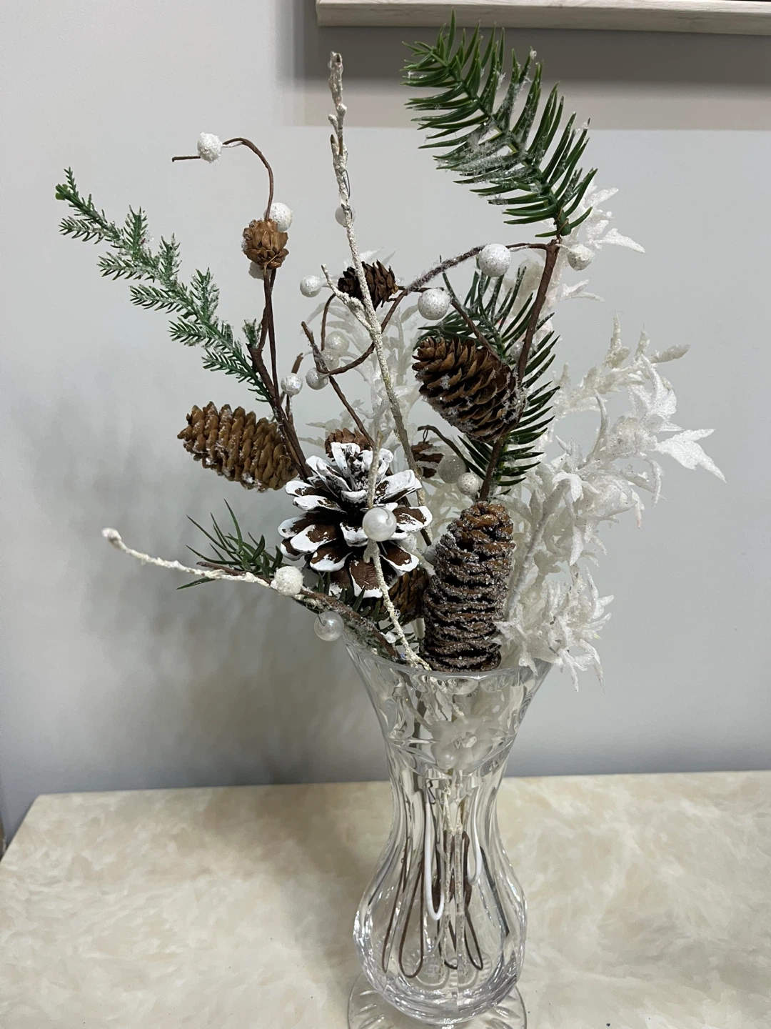 Selling a lovely winter floral arrangement! It features pinecones, white berries, and frosted greenery. It would be perfect for adding a festive touch to your home during the colder months.