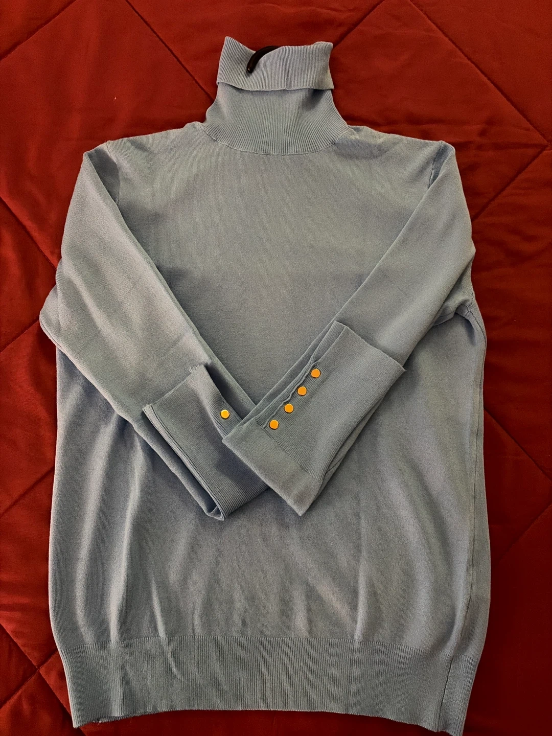 Here's a light blue turtleneck sweater that's looking for a new home! It features a classic turtleneck design and stylish button detailing on the sleeves. A great addition to your wardrobe for a touch of elegance and warmth