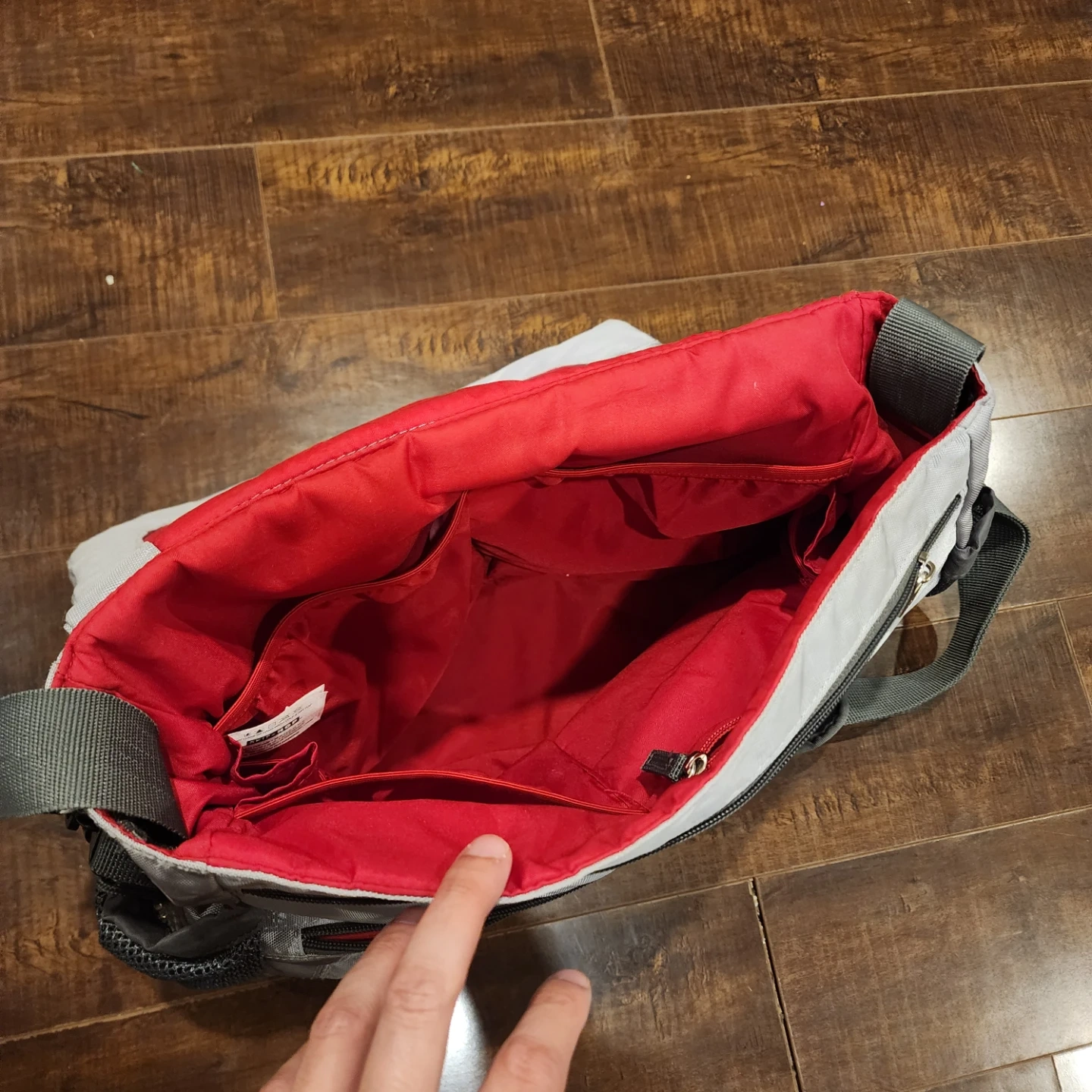 I'm selling a Skip Hop diaper bag in grey. It features a red interior with lots of pockets for organization. Perfect for carrying all your baby essentials!