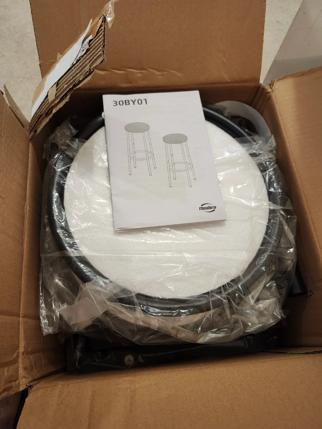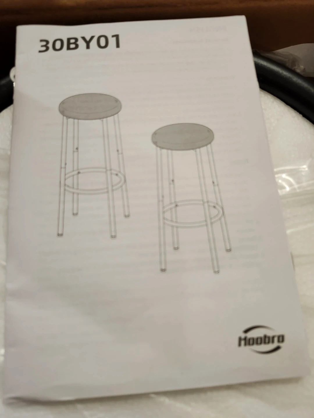 Selling a bar stool with a rustic brown seat and sturdy steel frame. It's perfect for a kitchen, dining room, or party! The stool has a comfortable footrest and is easy to assemble. Dimensions are approximately 25 inches tall with a 12 inch diameter seat.