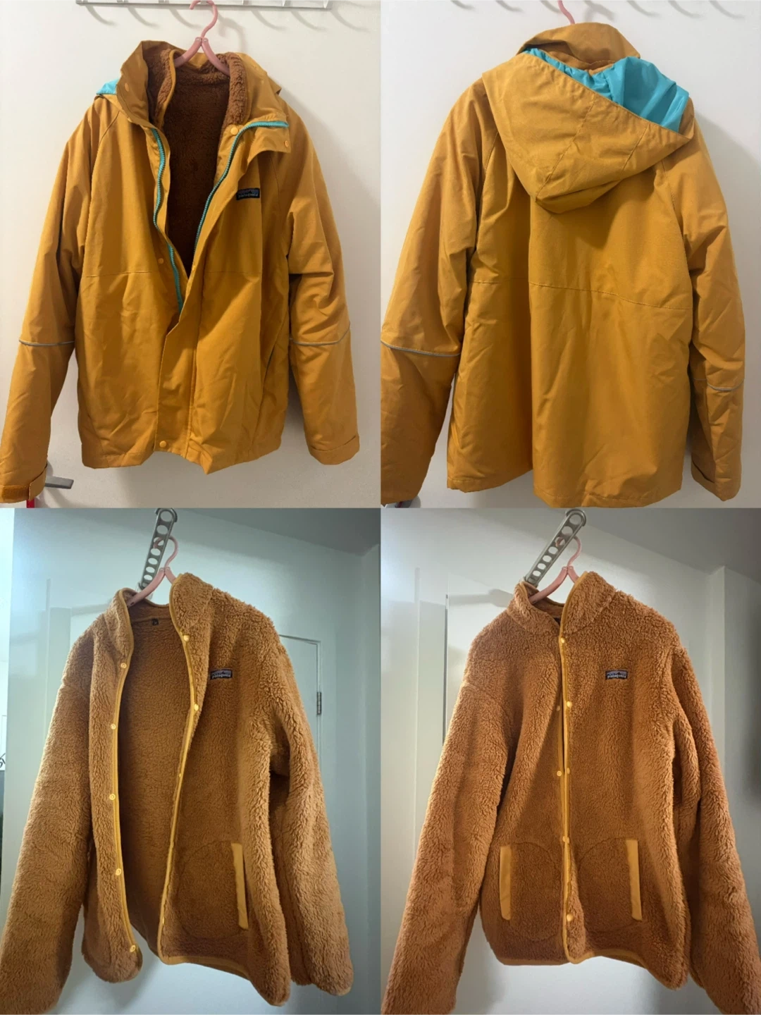 Selling a gently used Patagonia reversible jacket! One side is a gold-toned shell with a hood, perfect for wind and rain. The other side is a cozy brown fleece. It's like getting two jackets in one!