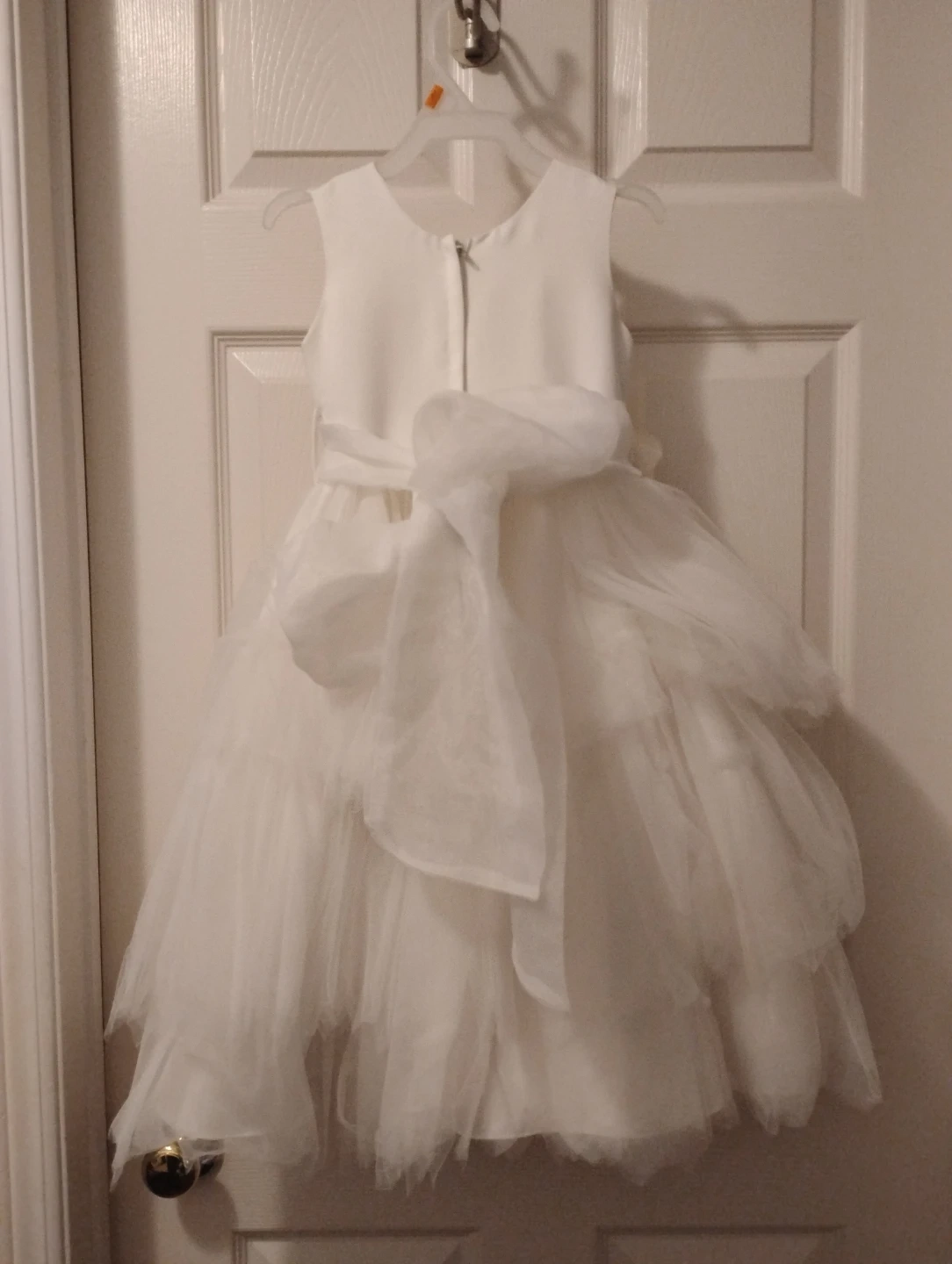 A beautiful white dress, perfect for a flower girl or special occasion! The dress features a layered tulle skirt and a decorative flower detail. It's in great condition and ready for its next event.