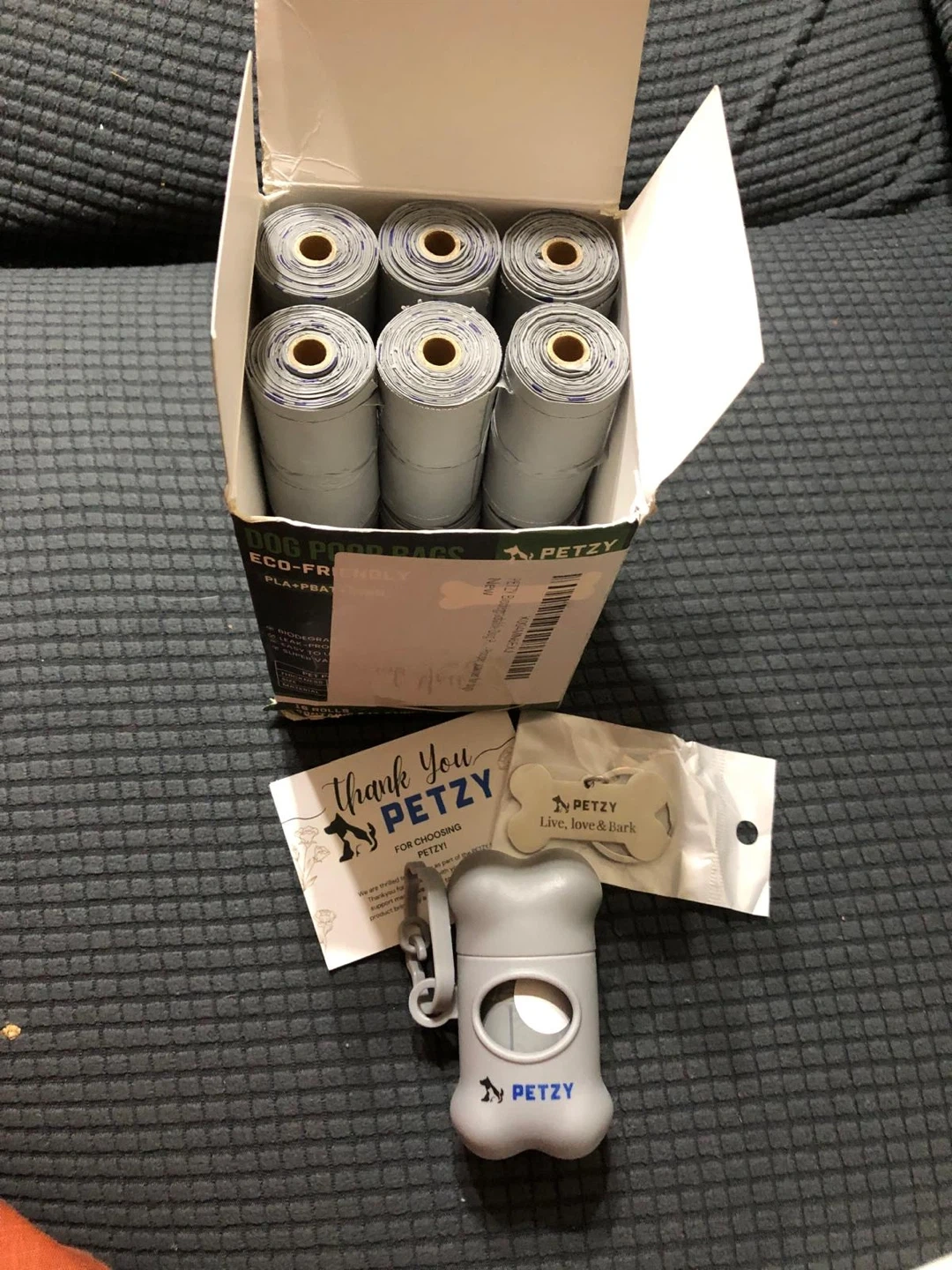 Selling a new box of Petzy dog poop bags. They are eco-friendly, biodegradable, leak-proof, and durable. The box includes 16 rolls of bags and a bone-shaped dispenser. Super value pack!