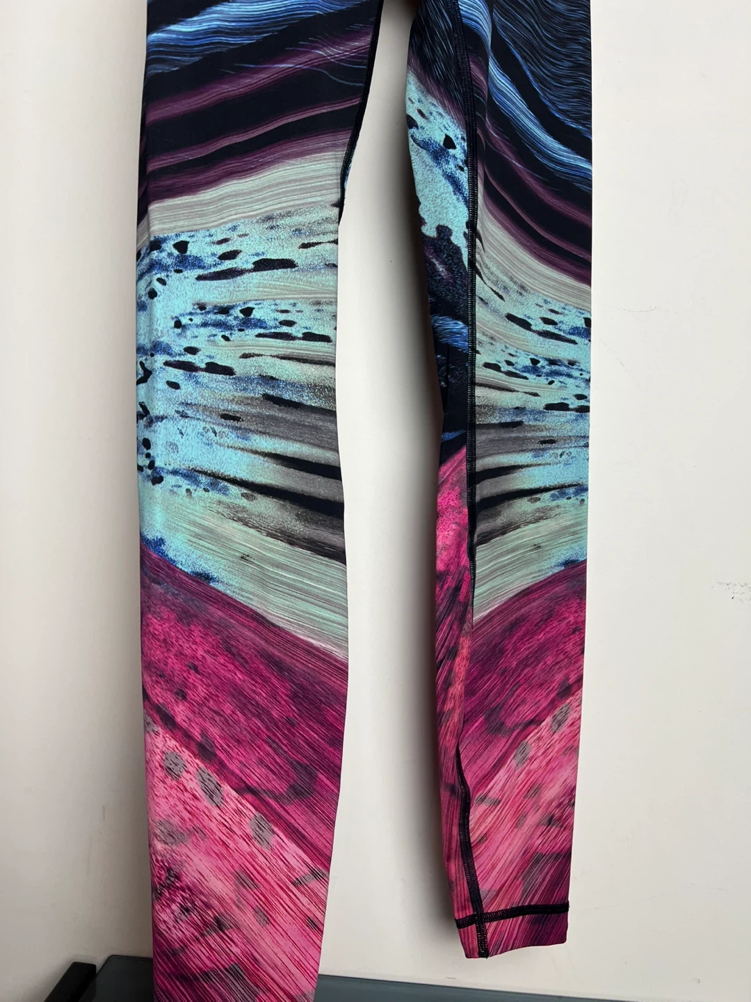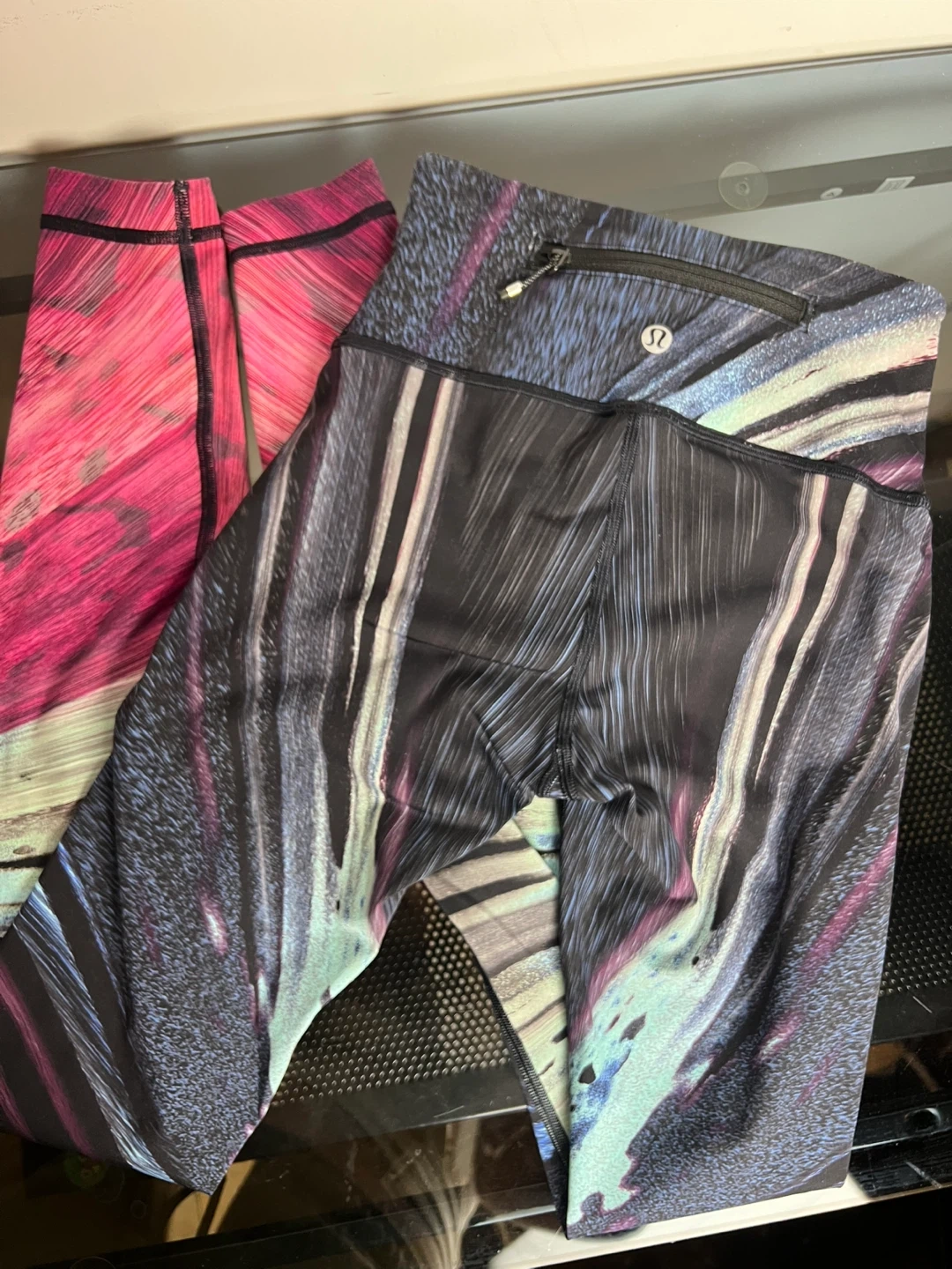 Selling a pair of Lululemon leggings. They feature a unique design with colours like pink, blue, and black. Please note that the size is unknown, so check the photos to see if they're a good fit for you!