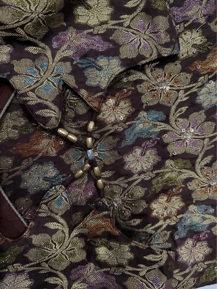 Gorgeous 3-piece ethnic suit in rich brown and gold tones with beautiful multi-colour floral brocade work. Includes matching kameez, dupatta with heavy border, and bottoms.