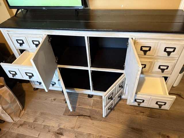 Originally an IKEA bookshelf adapted as a cabinet with 8 sliding drawers and 4 cabinets (see photo). It has been chalk painted with other flair added. Measures 58.75” W x 34.25” H x 16” D. I can help load but I do not transport.
