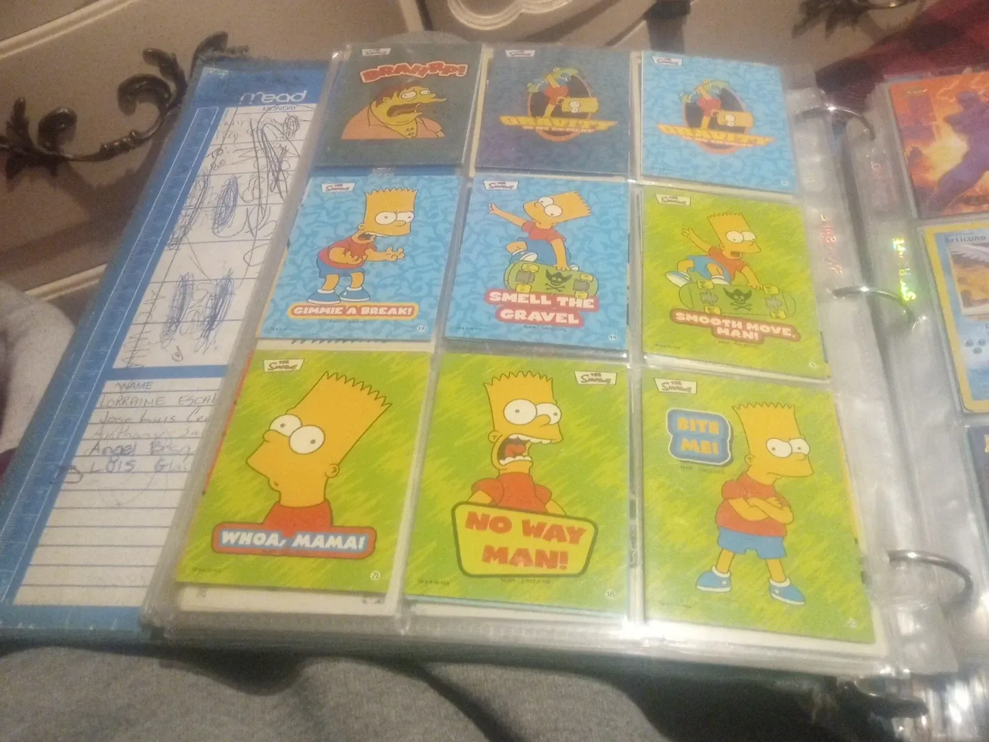 I have a collection of The Simpsons cards. They feature Bart Simpson with various funny expressions and sayings, like "Gimmie a Break!", "Smell the Gravel", "Smooth Move, Man!", "Whoa, Mama!", "No Way Man!", and "Bite Me!".