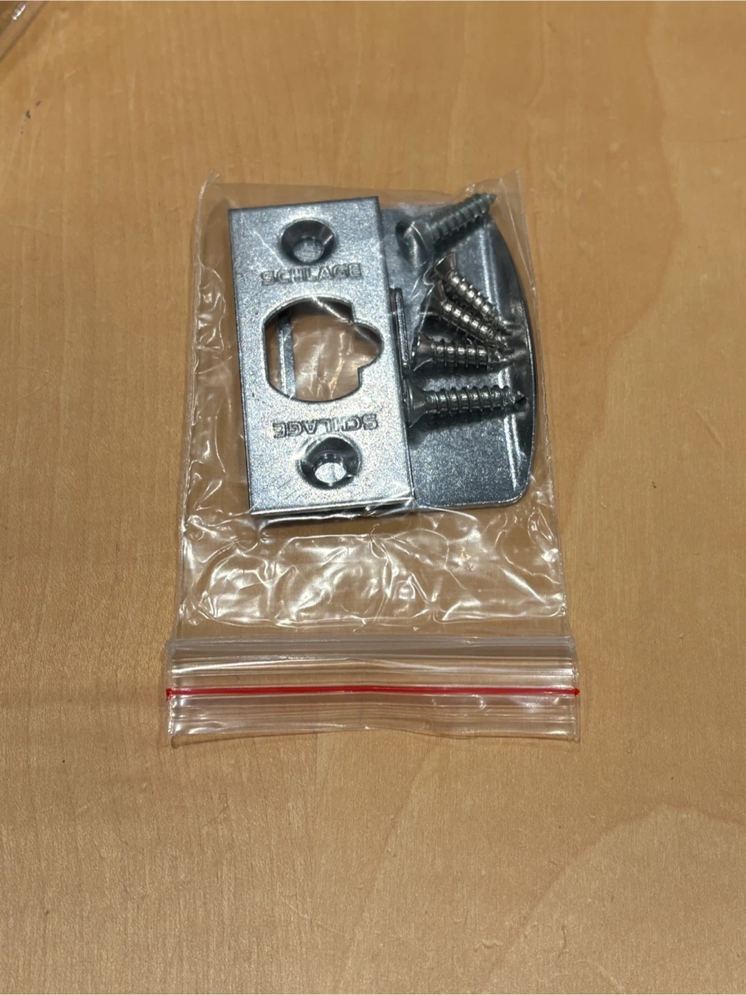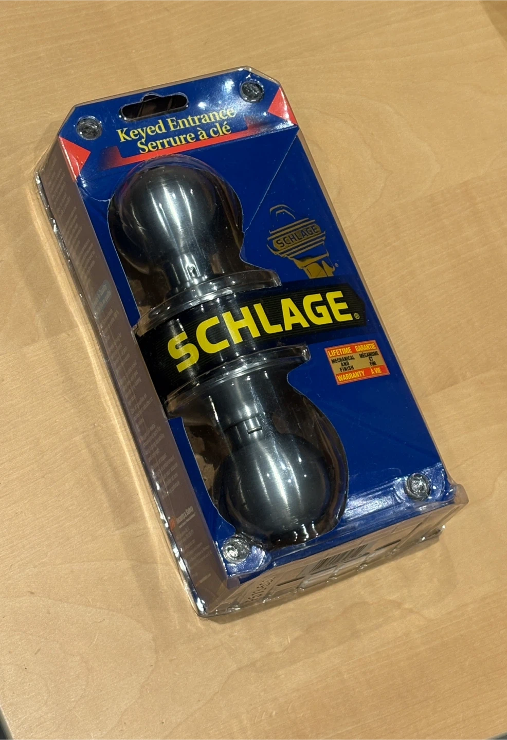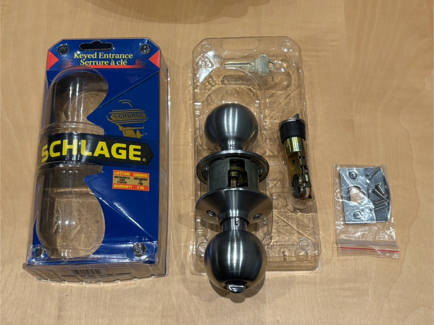 Selling a used Schlage keyed entrance doorknob! It comes with all the original components and accessories, including the latch, strike plate, screws, and keys. Still in the original packaging.