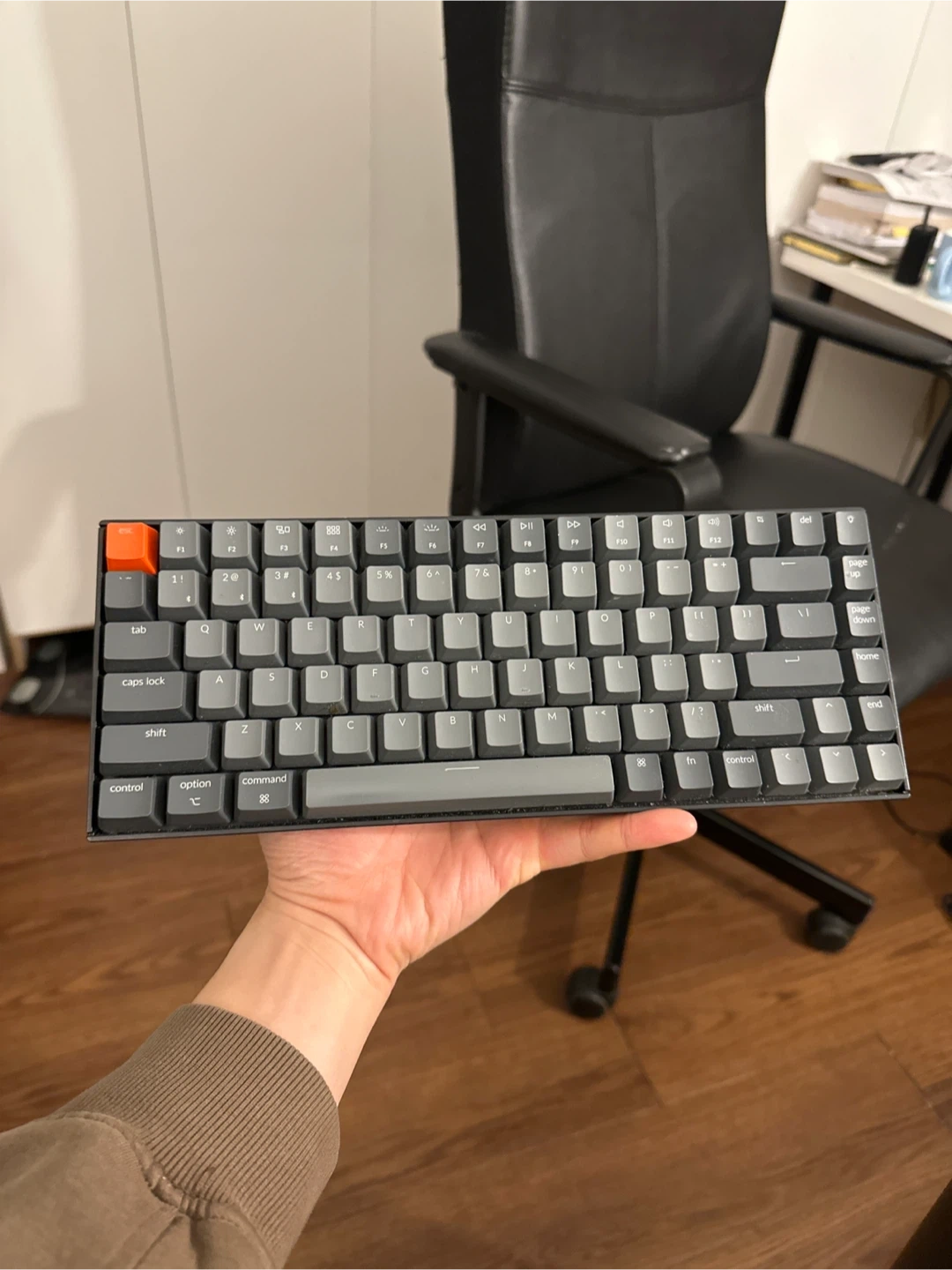Selling a Keychron K2 keyboard. It's gray and compact, perfect for a smaller desk setup. It's in used condition but still works great!