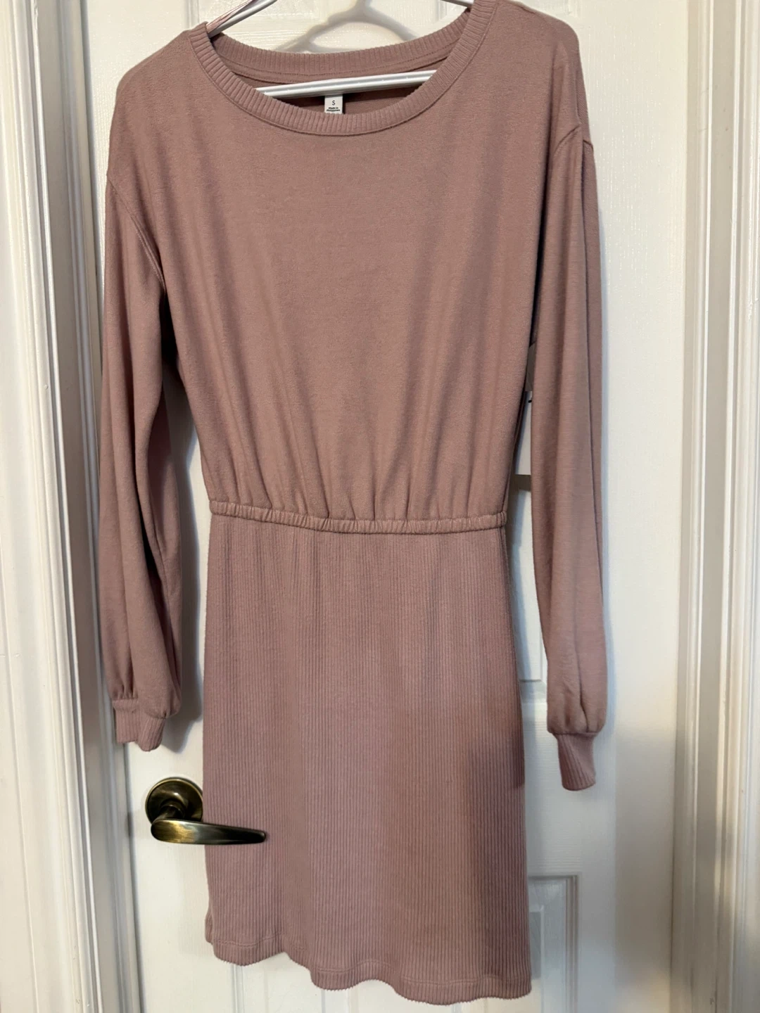 A lovely mauve dress from Nine West! It's a size small and features a comfortable, stretchy fit. Perfect for a casual day out or dressing up for an evening occasion. The ribbed texture adds a touch of sophistication to this versatile piece