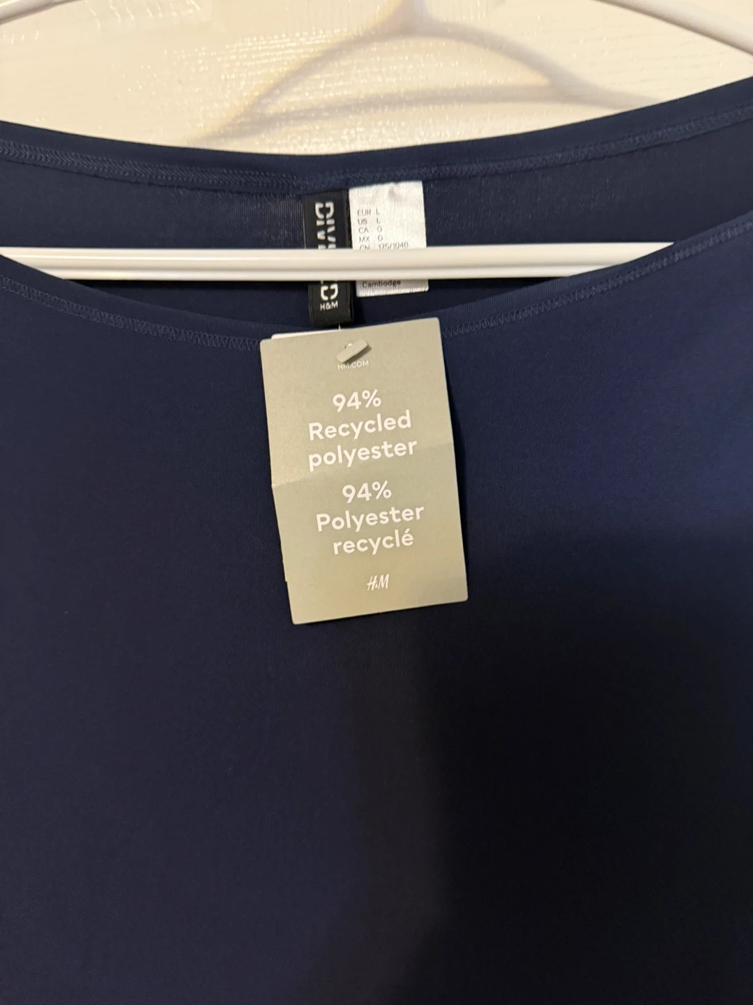 I'm selling a brand new H&M dress in a beautiful navy blue colour! It's a size small and made of 94% recycled polyester, so it's comfy and eco-friendly. Perfect for any occasion!