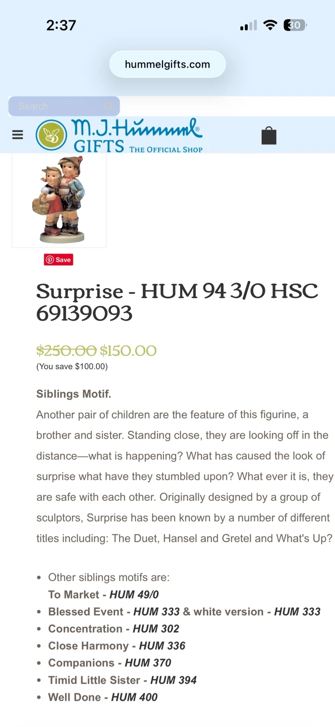 Selling a charming M.I. Hummel figurine titled "Surprise" with the model number HUM 94 3/0 HSC. This delightful piece features a brother and sister, showcasing the siblings motif that Hummel is known for. Prices vary, but most above the $200+, it’s a lovely addition to any collection. Pick up Haysboro SW.