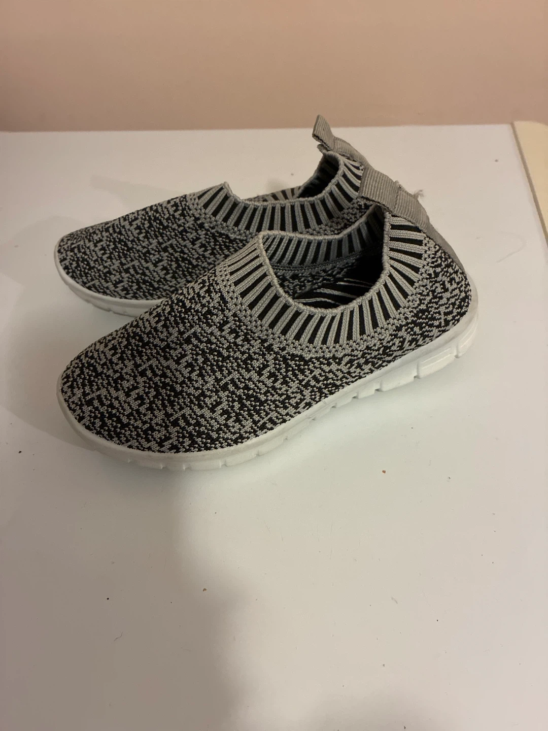 Selling a pair of comfy slip-on sneakers! They feature a stylish black and grey knit pattern and a white sole. Perfect for everyday wear! Child size 13. Barely worn.