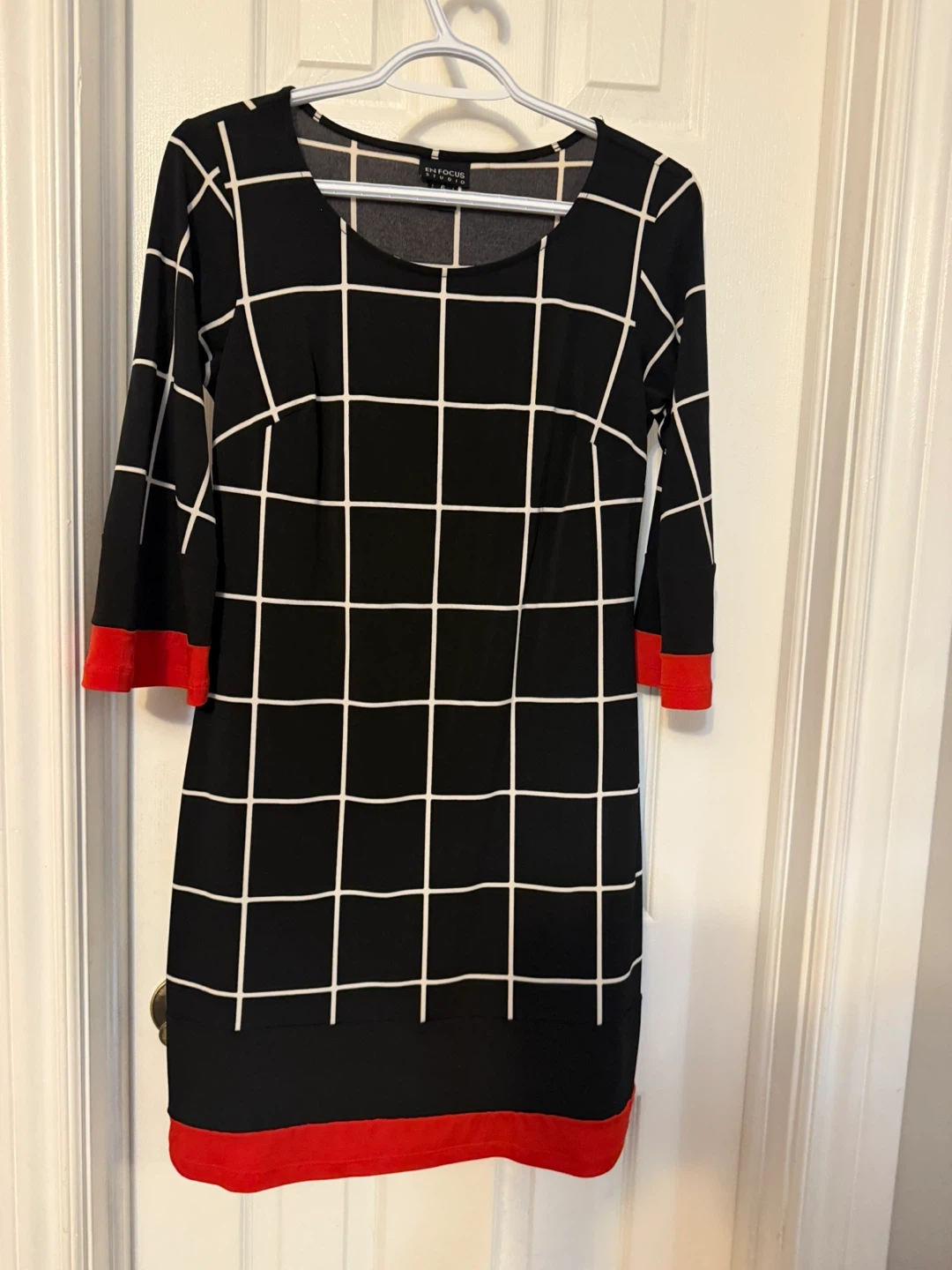 I'm selling an En Focus Studio dress in a stylish black and white grid pattern with red accents! It's a size 6 and in great condition. Perfect for adding a touch of modern flair to your wardrobe