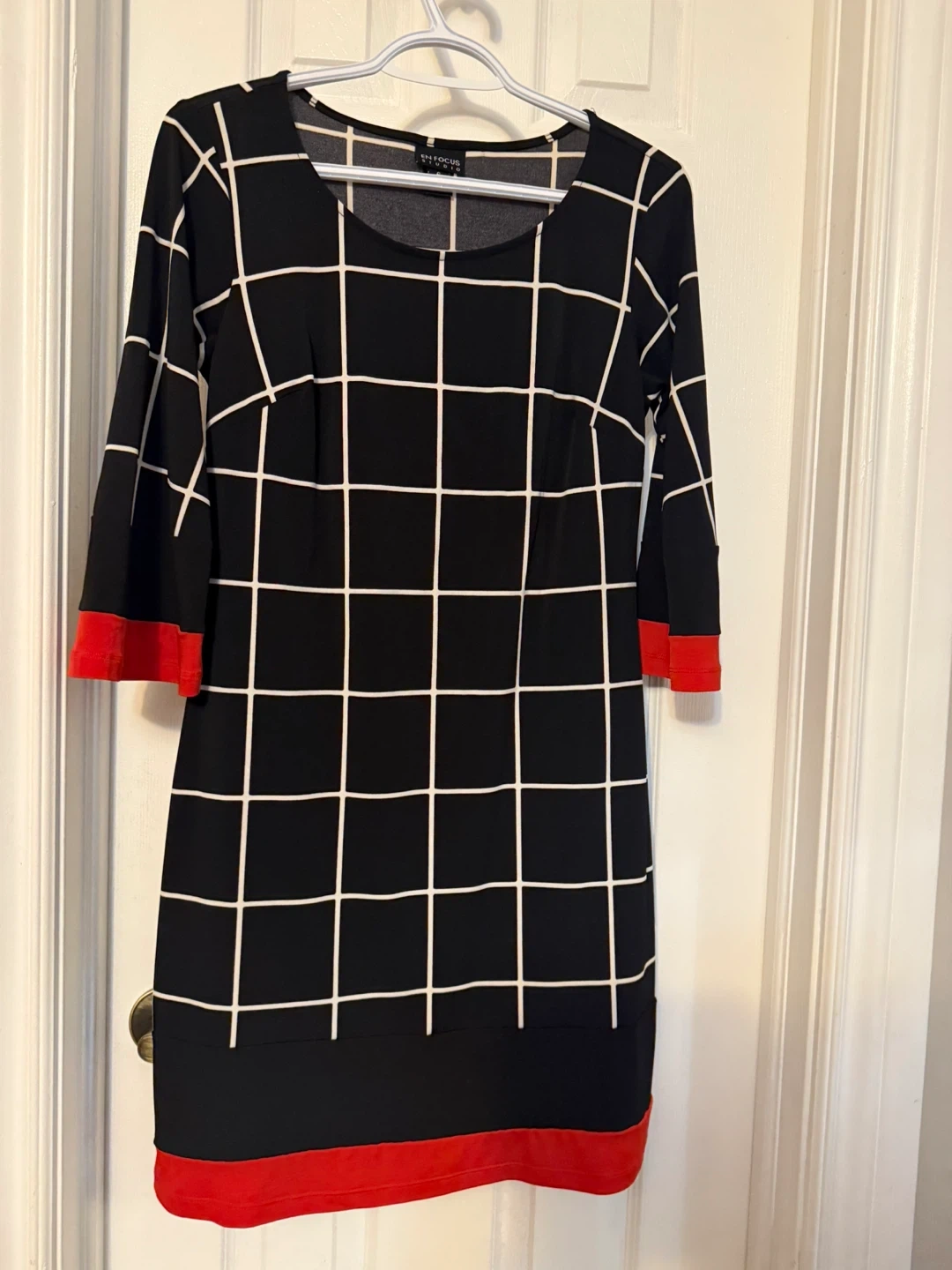 I'm selling an En Focus Studio dress in a stylish black and white grid pattern with red accents! It's a size 6 and in great condition. Perfect for adding a touch of modern flair to your wardrobe
