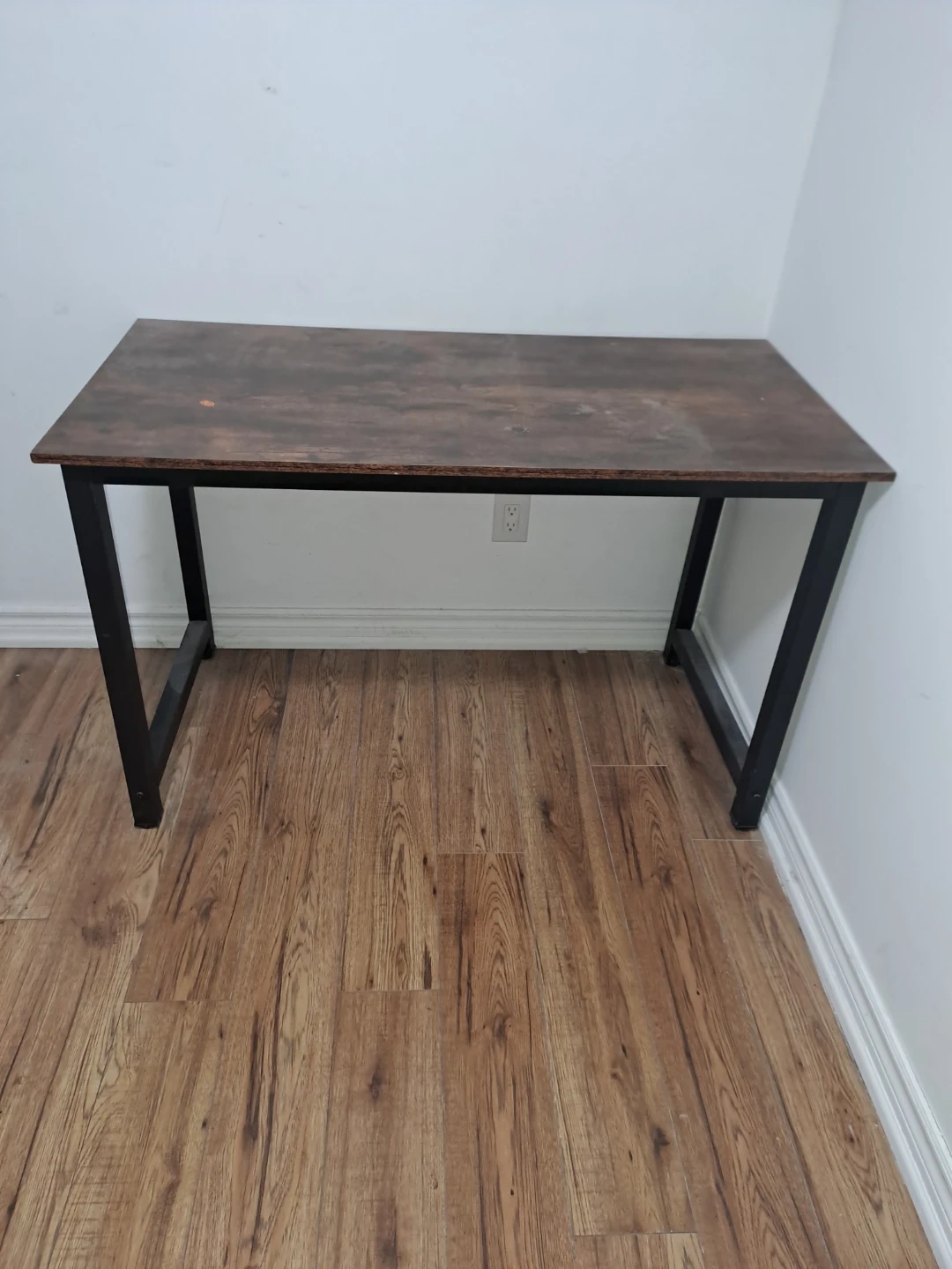 Selling a desk with a brown wooden top and black metal legs. It's in good condition and ready for a new workspace!