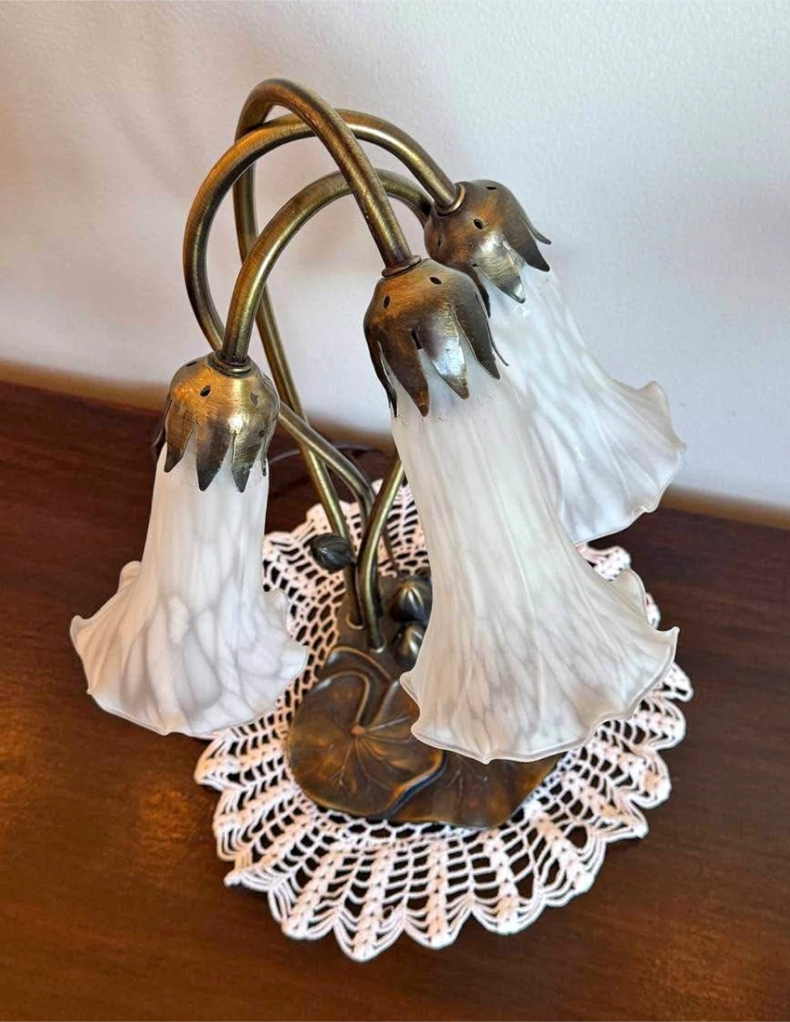 This is a beautiful vintage-style table lamp with a floral design. It features three frosted white glass shades shaped like flowers, complemented by a bronze-coloured metal base and stems. It would add a touch of elegance to any room!