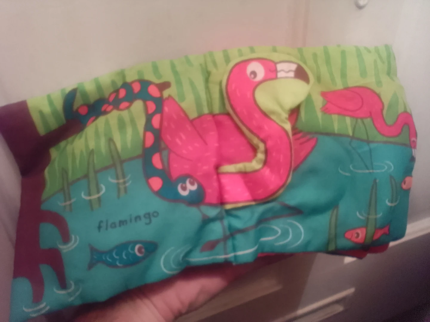 Selling a Melissa & Doug K's Kids soft book featuring wild animals. It's in great condition and perfect for babies and toddlers! The book is colorful and engaging, with different animals like a lion, rhino, zebra, flamingo, and alligator.