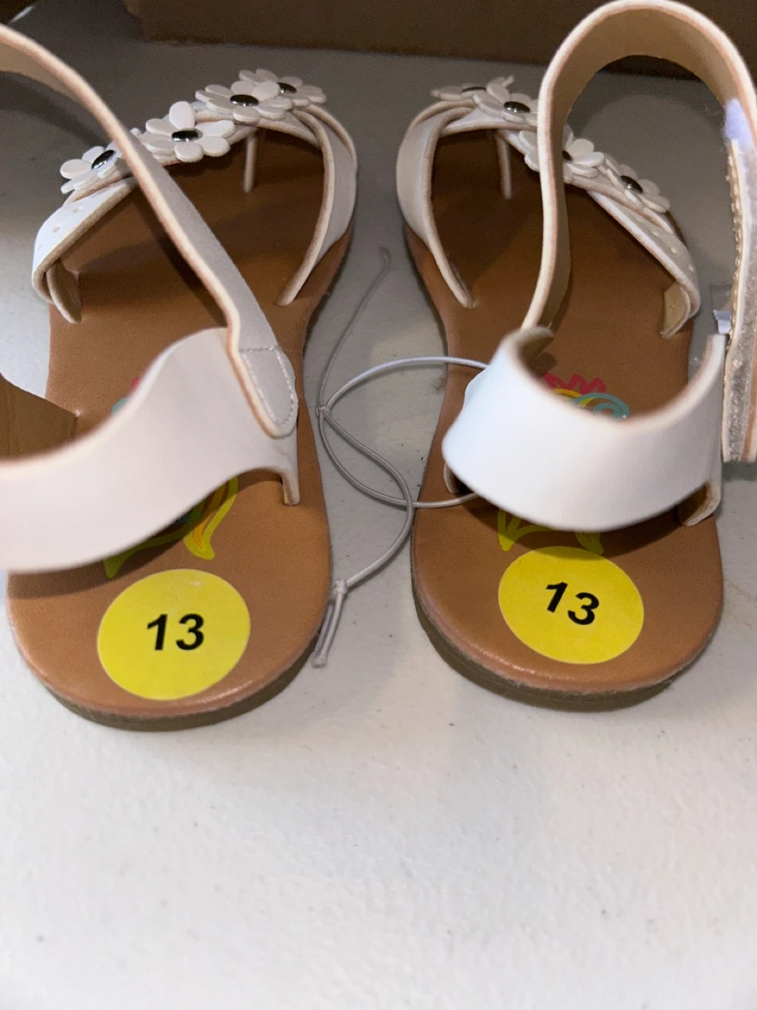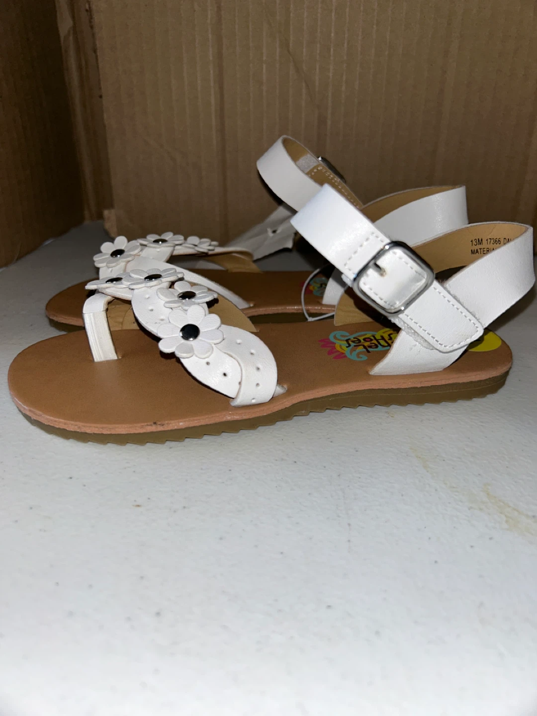 These adorable sandals are perfect for your little one! They feature a cute flower design on the white straps and are a size 13. The brand is Sasha & Sophia. They're in great condition and ready for a new adventure!