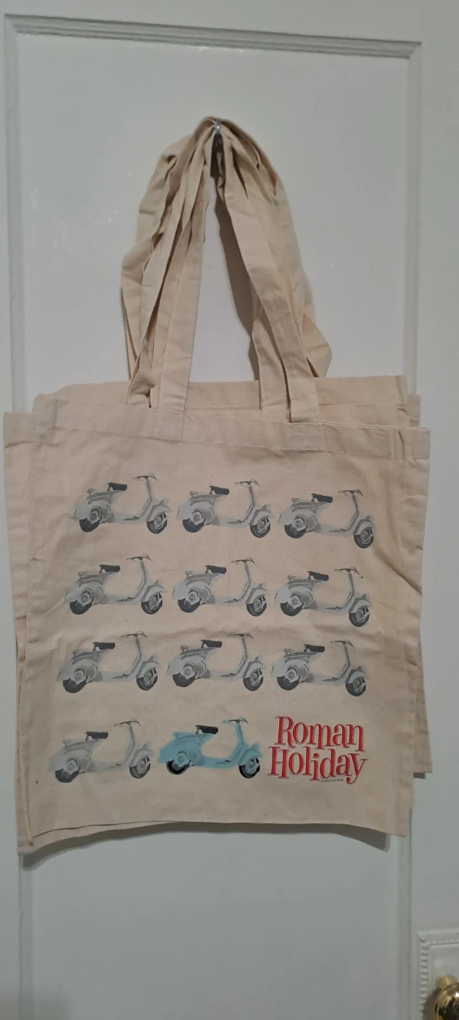 Here's a cute tote bag featuring a vintage scooter design and the words "Roman Holiday"! It's a great way to carry your everyday items in style. 5 bags for 40