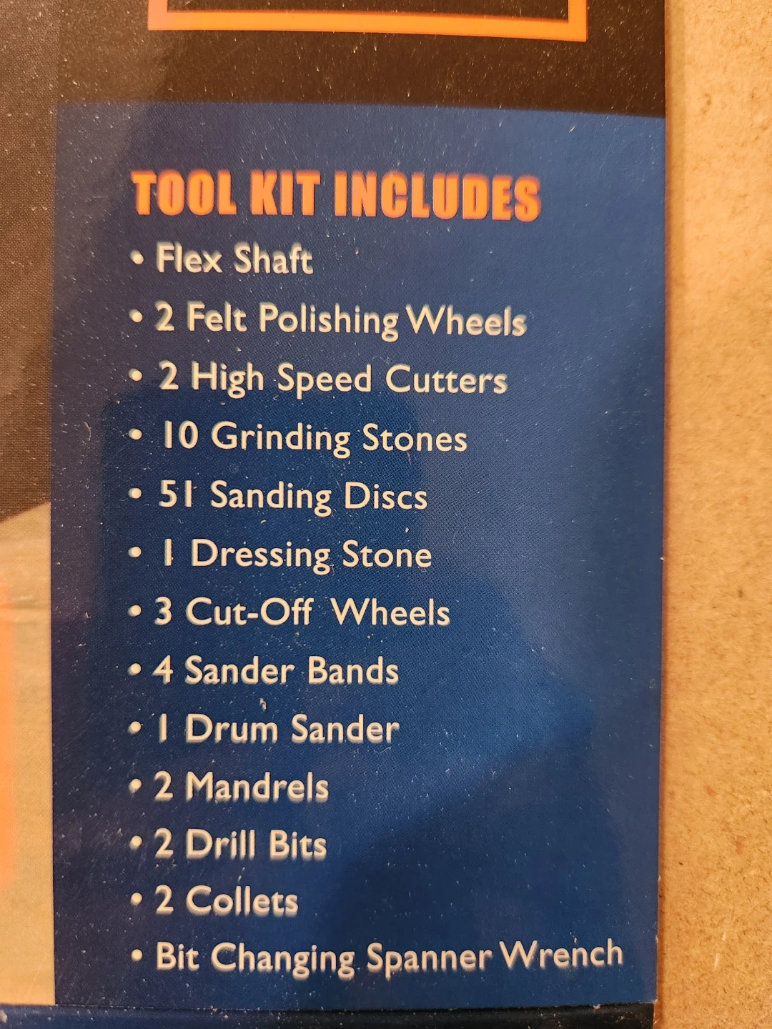 It also comes with the box. It accepts Dremel accessories. Unlike the Dremel the flex shaft is included.