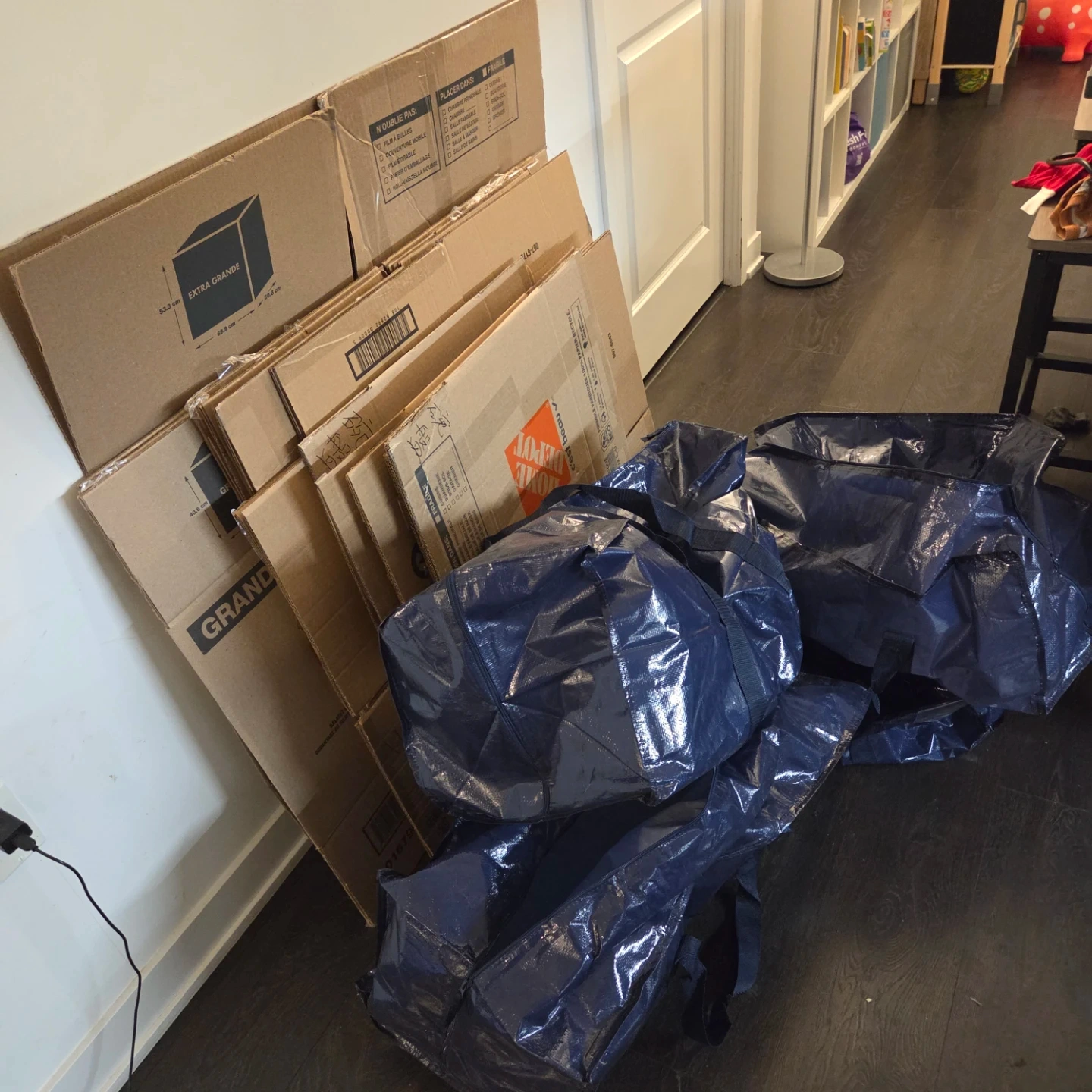 Moving boxes in various sizes : 1 XL 3 L 4 M 6 S Plus 4 90L moving bags with zippers are available. Great for your next move! I only used them once. I just moved 1 week ago.
