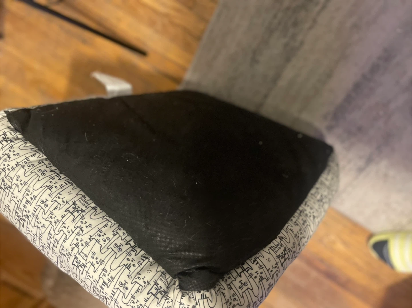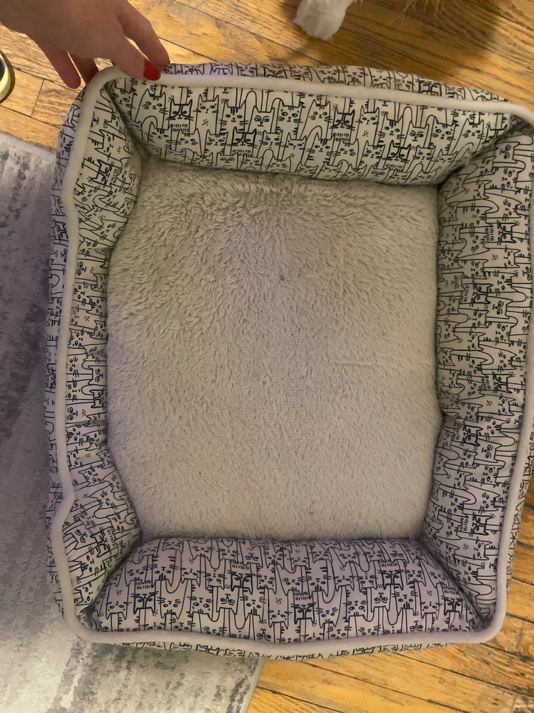 Selling a comfy pet bed with a cute cat pattern! It measures approximately 32 cm in length. The inside is a soft, plush material, perfect for your furry friend to relax in