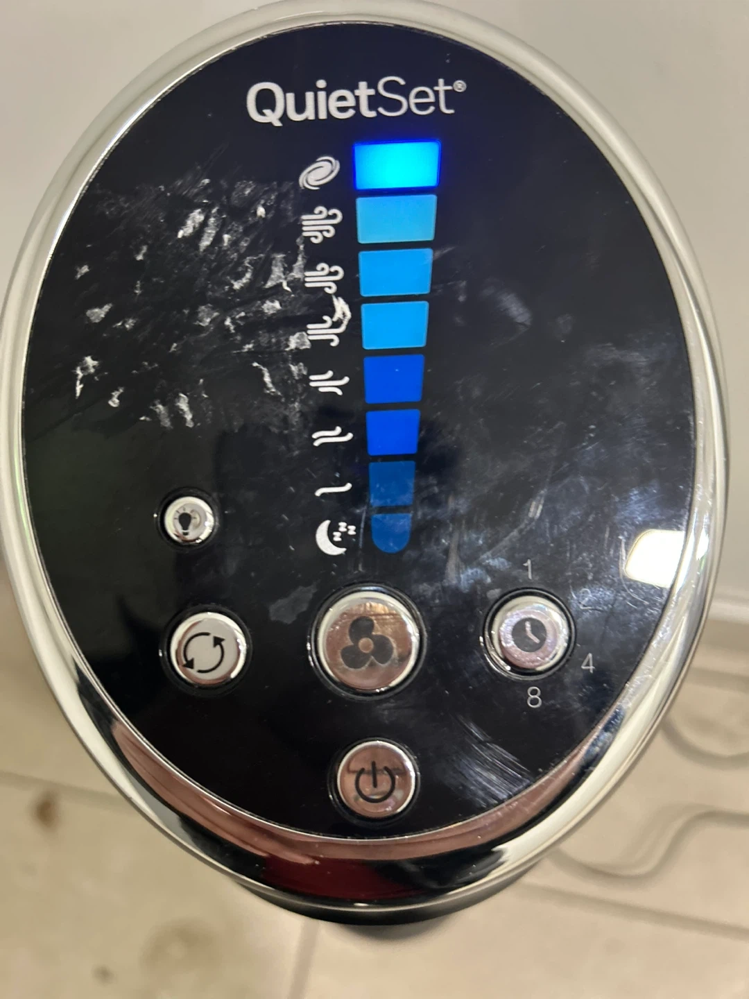 Selling a Honeywell QuietSet tower fan in black. It has multiple speed settings and a timer function. Great for keeping cool!