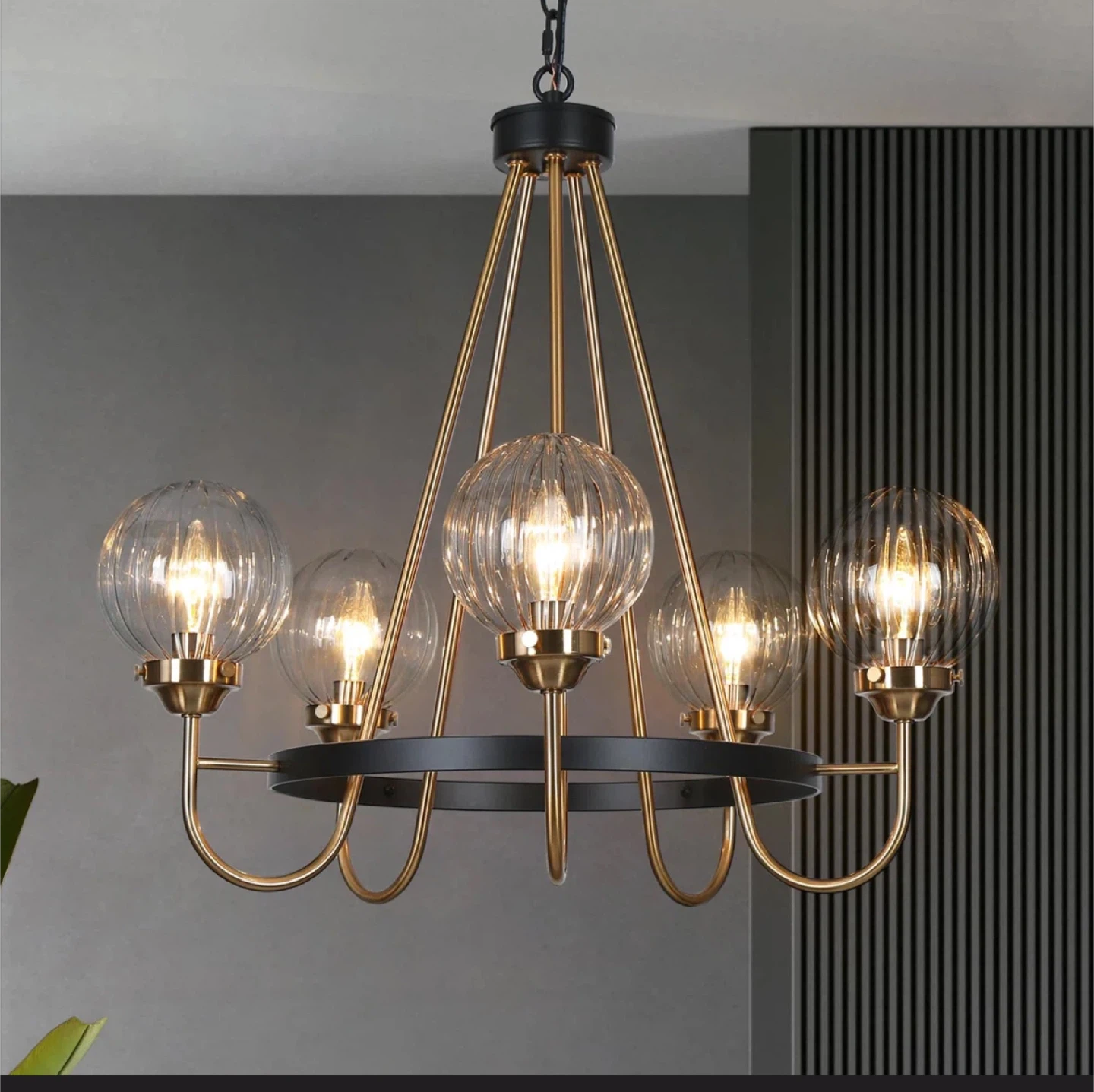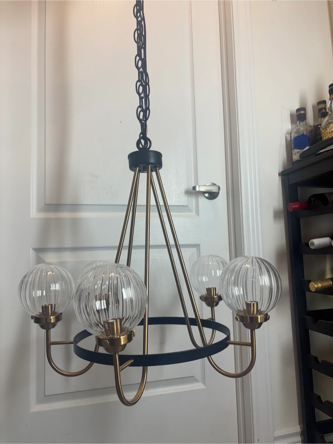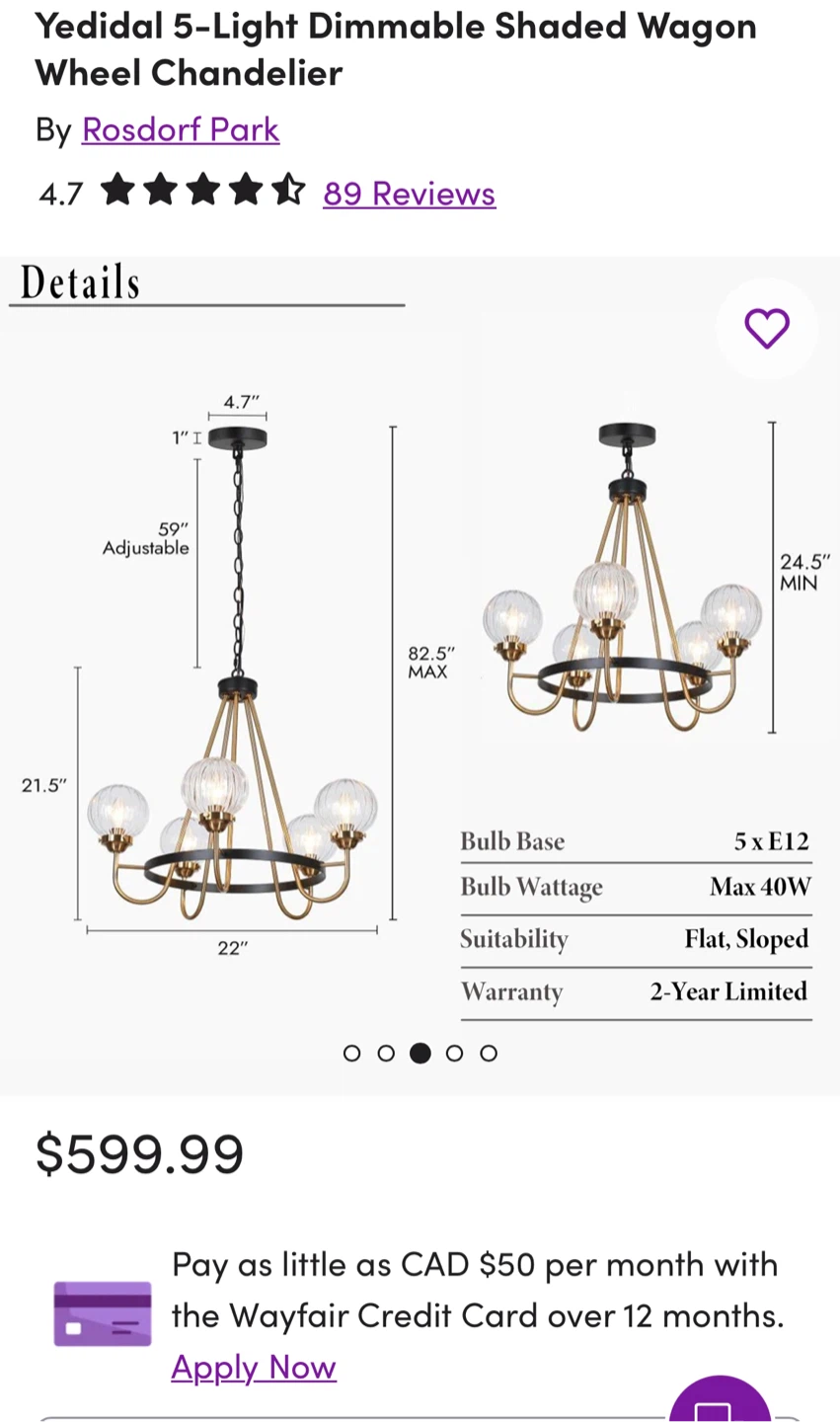 Selling a lovely Rosdorf Park Yediel 5-Light Dimmable Shaded Wagon Wheel Chandelier! This chandelier features a black and gold finish with clear, ribbed glass shades. It would be a great addition to any dining room or living room.