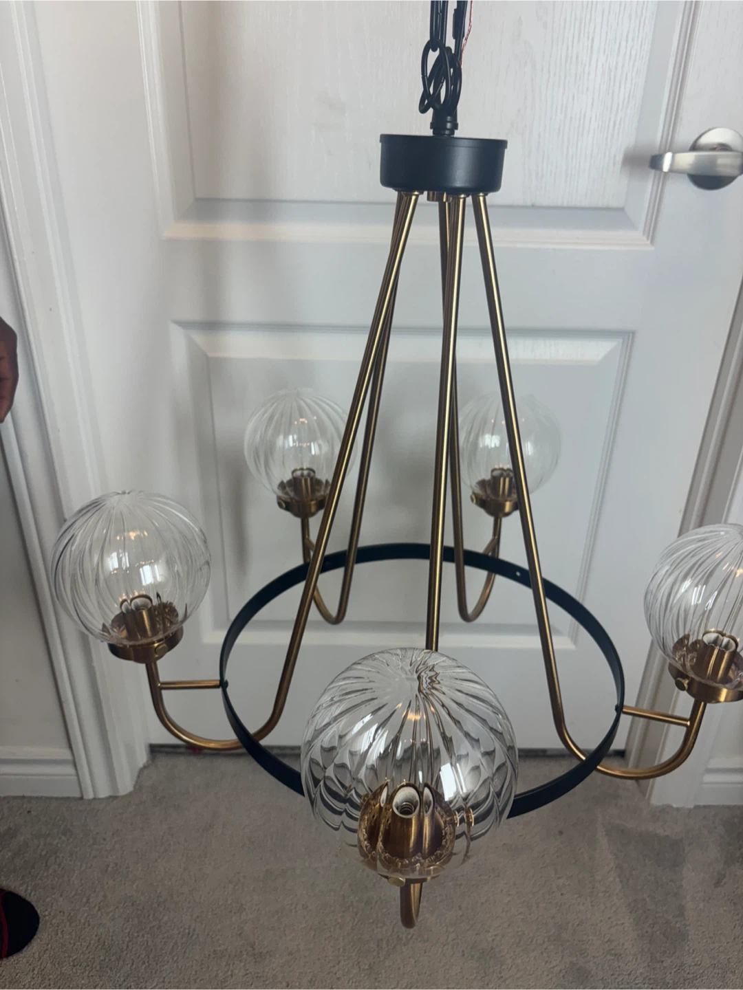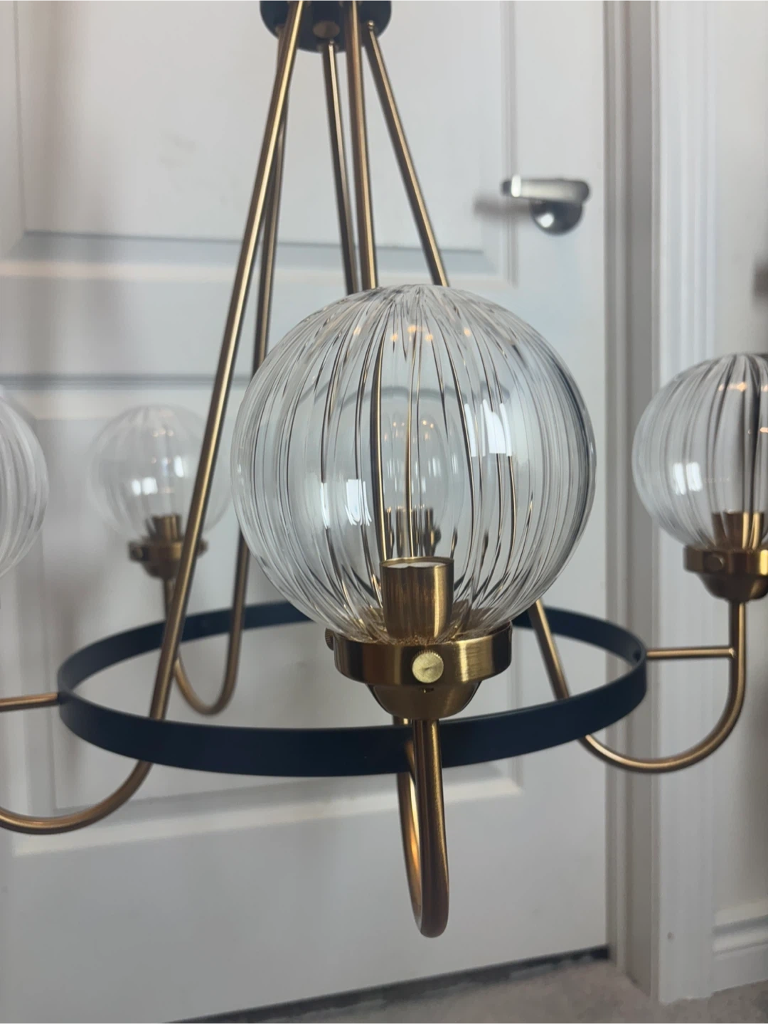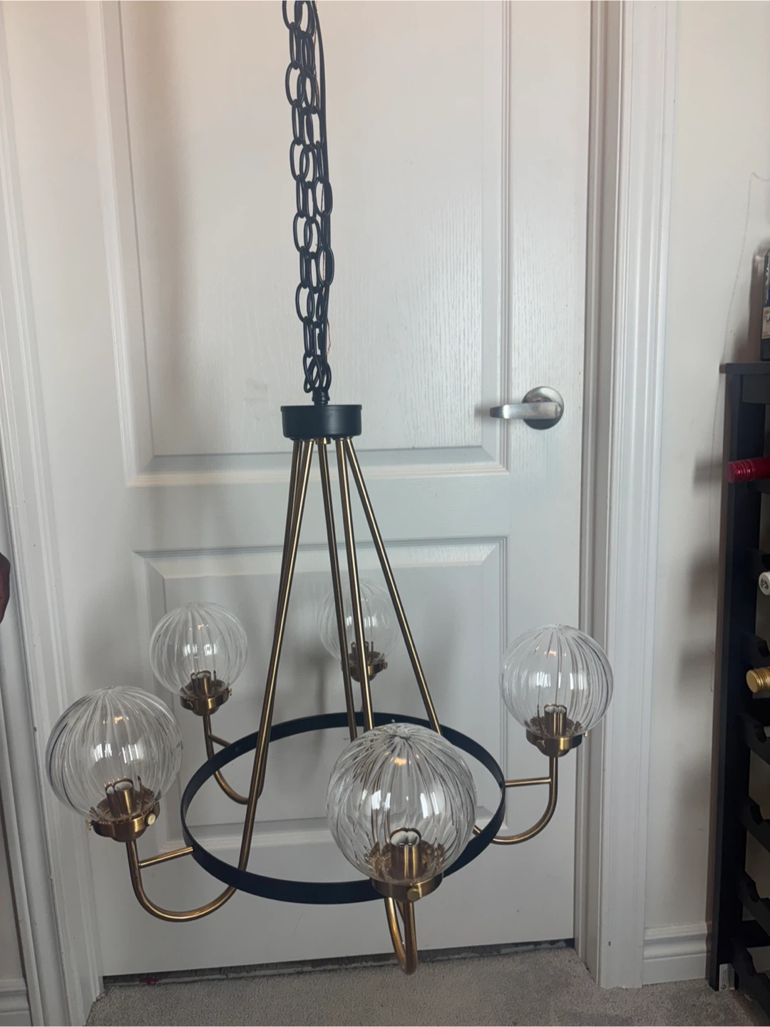 Selling a lovely Rosdorf Park Yediel 5-Light Dimmable Shaded Wagon Wheel Chandelier! This chandelier features a black and gold finish with clear, ribbed glass shades. It would be a great addition to any dining room or living room.