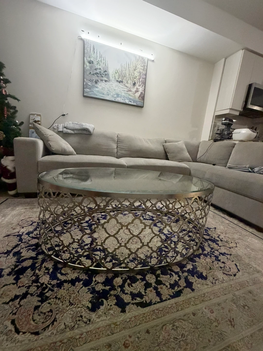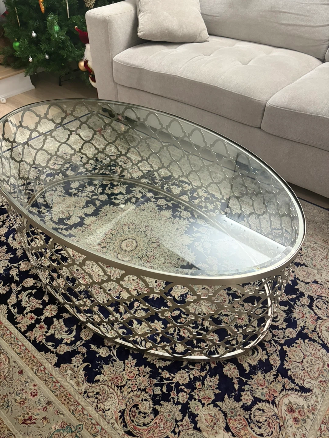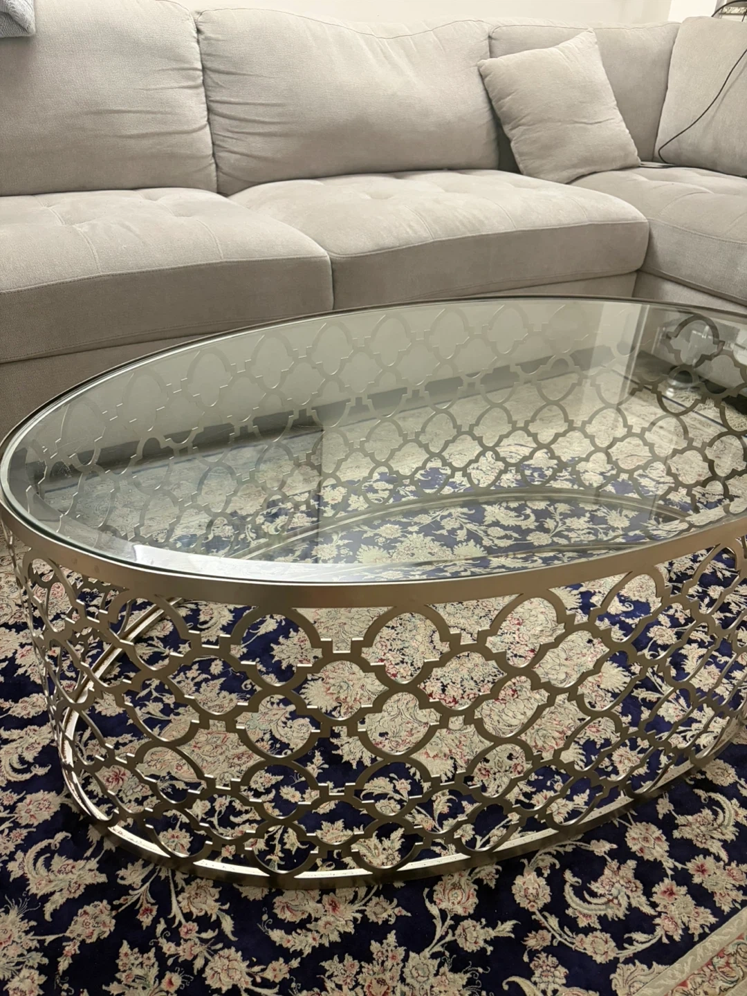 Selling a lovely oval coffee table with a glass top and a decorative metal base. It's in great condition and would be a stylish addition to any living room!
