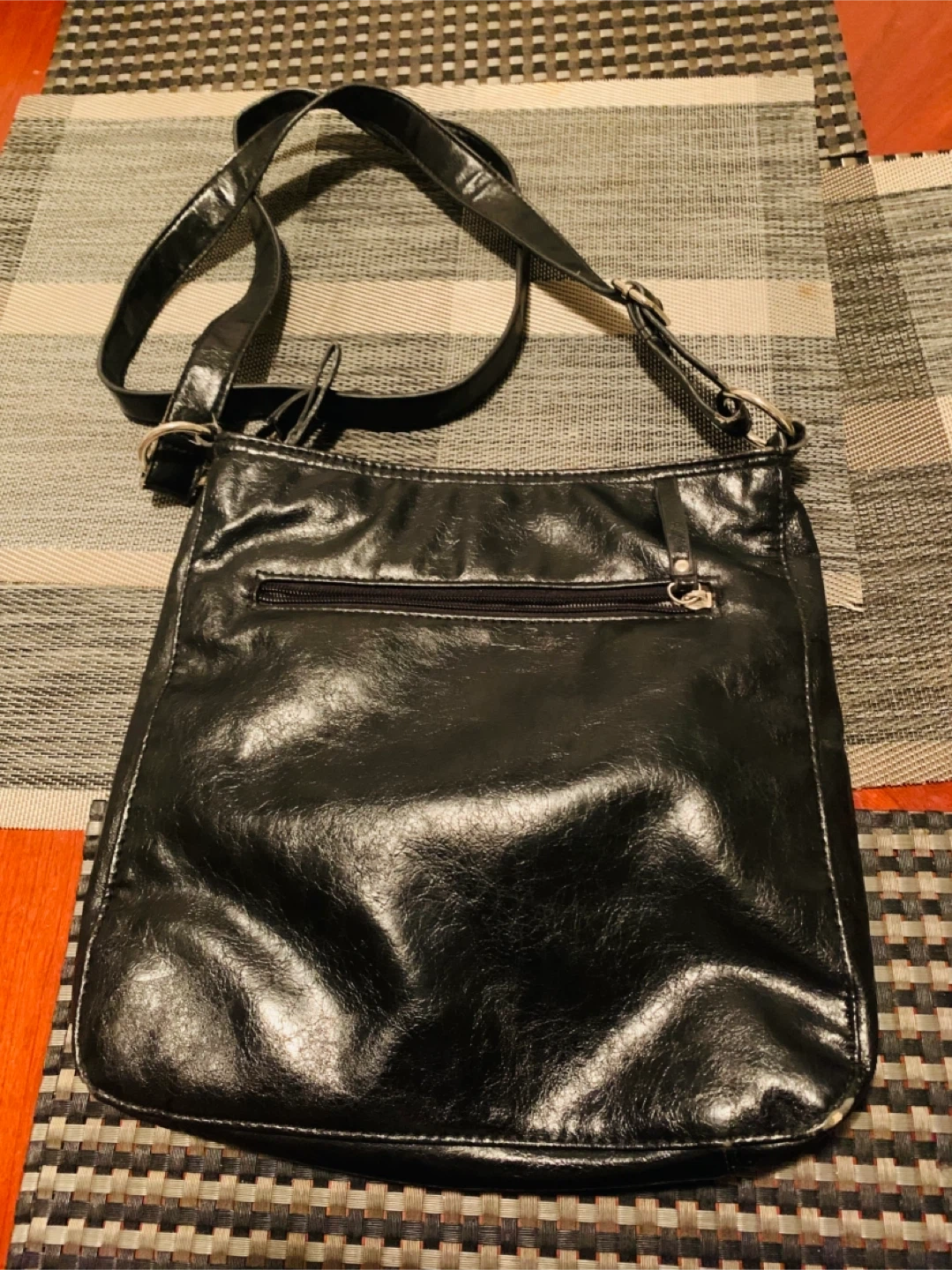 Ladies black purse with many pockets both inside and outside. All zippers work. Still in great condition. Smoke free home. Selling for $5 CAD firm.