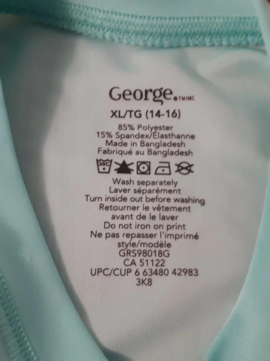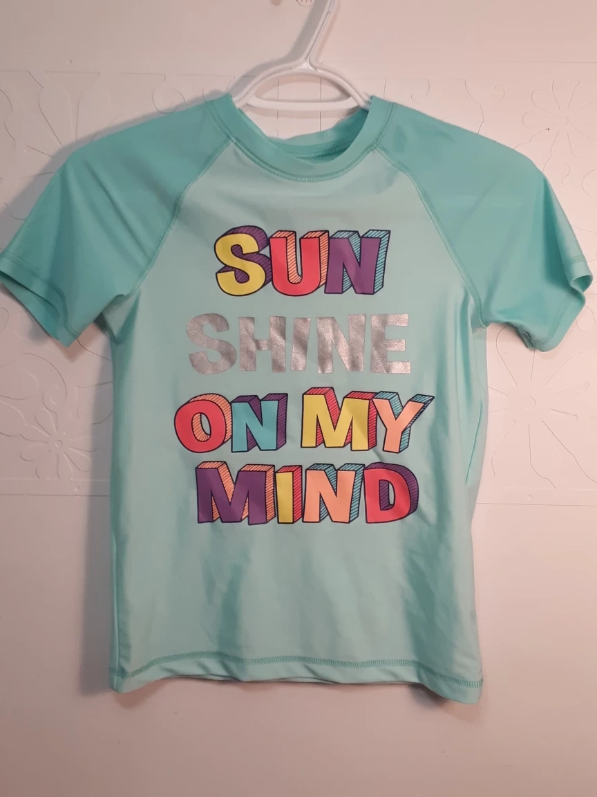 This cute George rash guard is perfect for sunny days! It's a girls' size XL (14-16) and features a fun "Sunshine on my Mind" design. Made of 85% polyester and 15% spandex, it's comfy and stretchy. Great for swimming or playing at the beach!