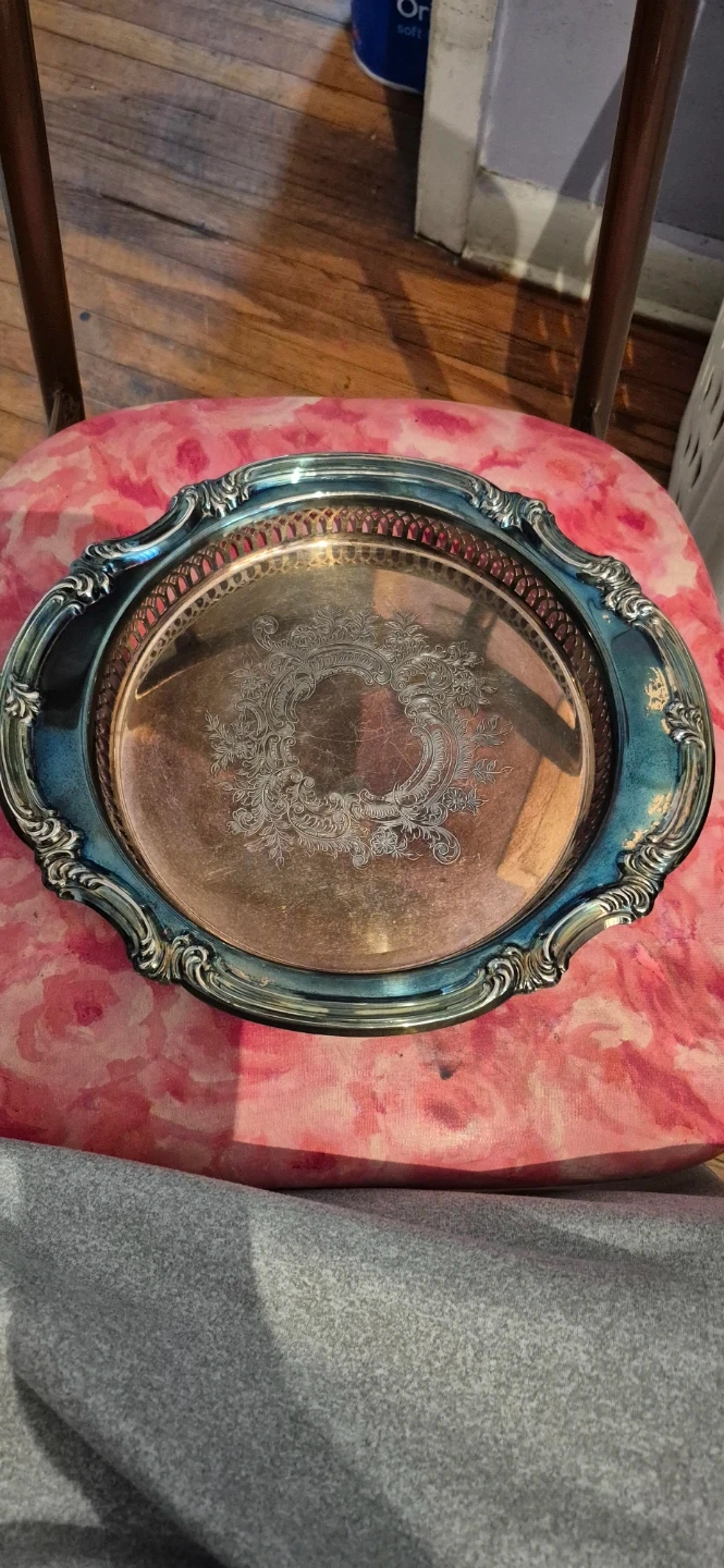 This is a beautiful vintage serving tray with an ornate, detailed design. It's silver plated and features an elegant filigree edge. It's a lovely piece for serving guests or as a decorative accent. It appears to be metal with a silver-plated finish. 12 inches across.