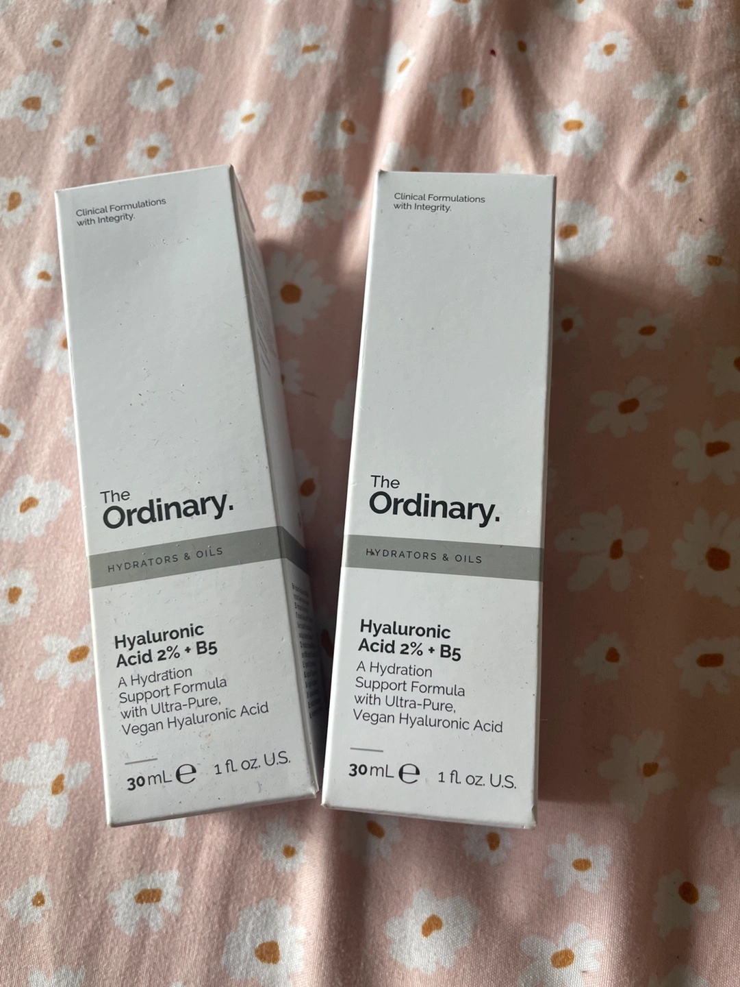 Two bottles of The Ordinary Hyaluronic Acid 2% + B5. Each bottle contains 30 ml.