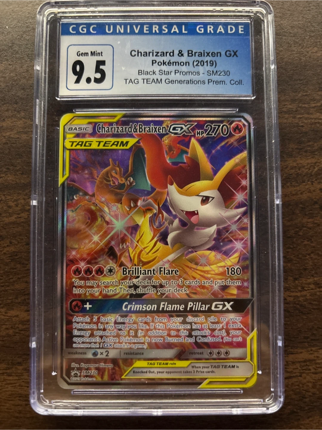 This is a graded Charizard & Braixen GX Pokémon card from 2019. It's a Black Star Promo SM230 and features the TAG TEAM Generations Premium Collection. The card is in Gem Mint condition with a grade of 9.5 from CGC Universal Grade.