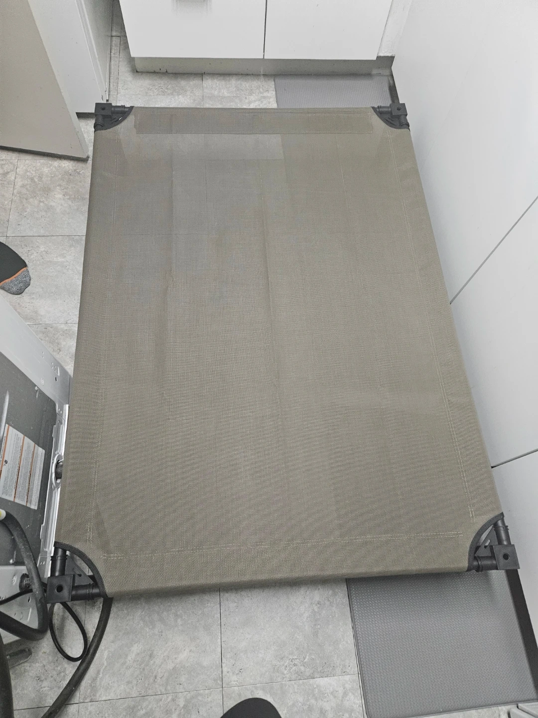 Selling a brown elevated dog bed. It's in great condition and measures 130cm in length, 24cm in width, and 91cm in height. Originally bought for $57.99!