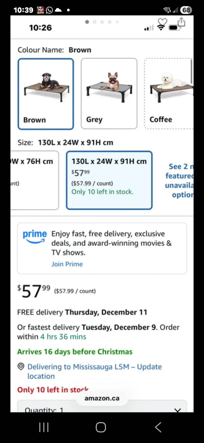 Selling a brown elevated dog bed. It's in great condition and measures 130cm in length, 24cm in width, and 91cm in height. Originally bought for $57.99!