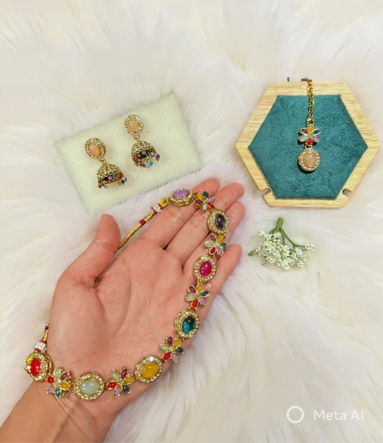 Selling a beautiful jewellery set that includes a necklace, earrings, and a maang tikka. The set features colourful stones and intricate detailing, perfect for adding a touch of elegance to any outfit