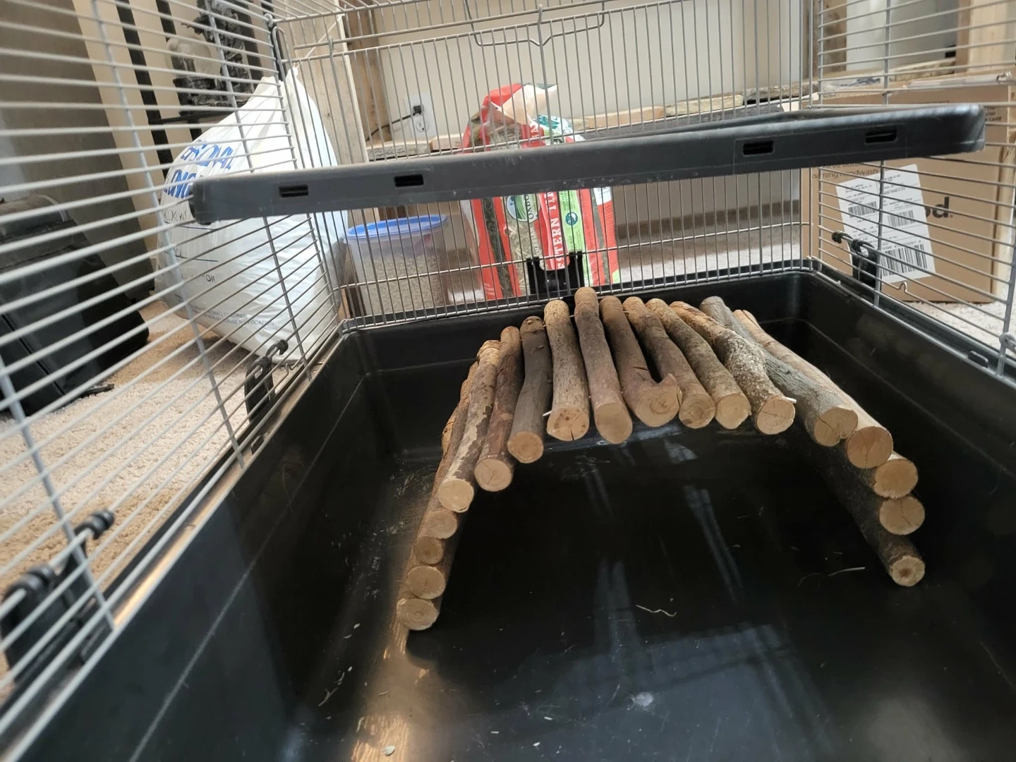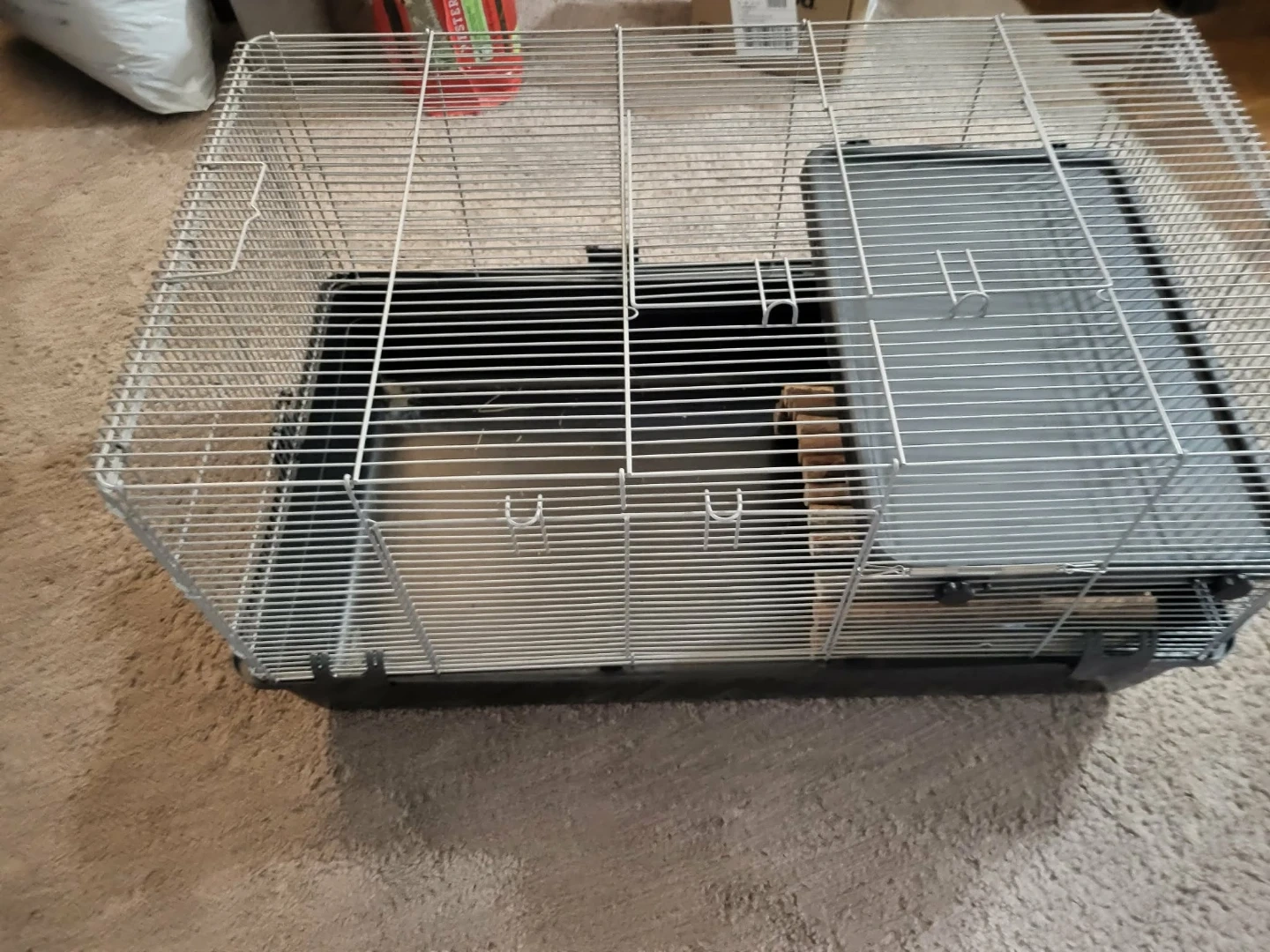 Selling a hamster cage that's in good shape! It comes with a little wooden bridge for your furry friend to climb on. Perfect for a small hamster or other small pet.
